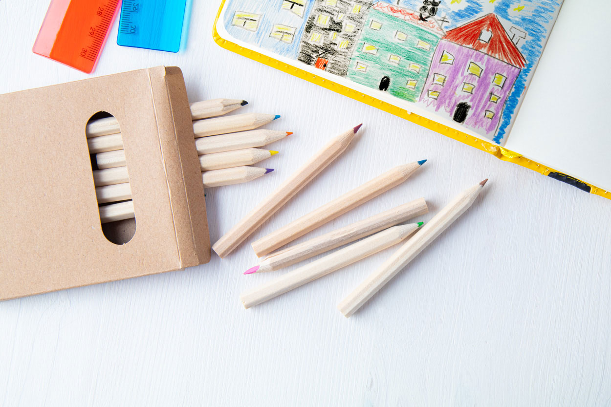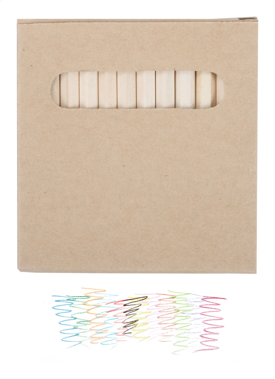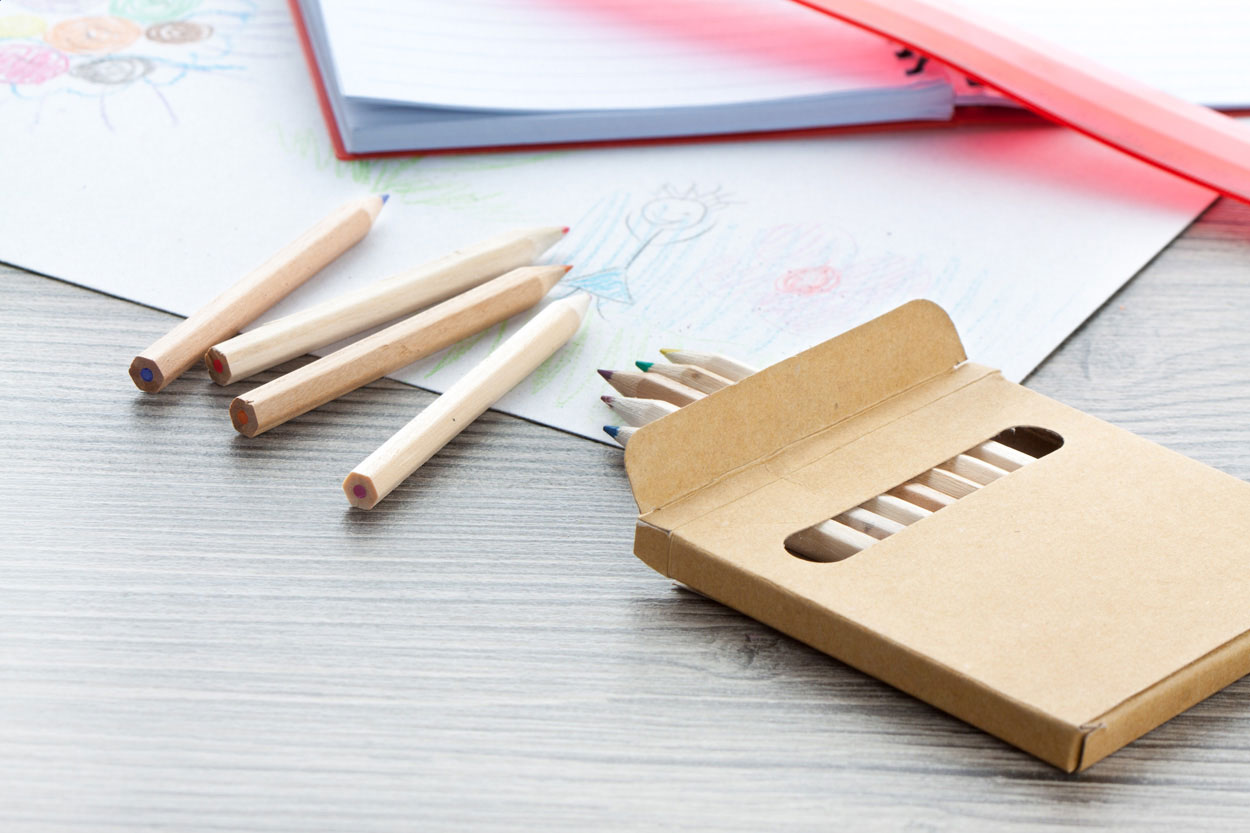 Dřevěné pastelky (12 ks) v papírové krabičce.