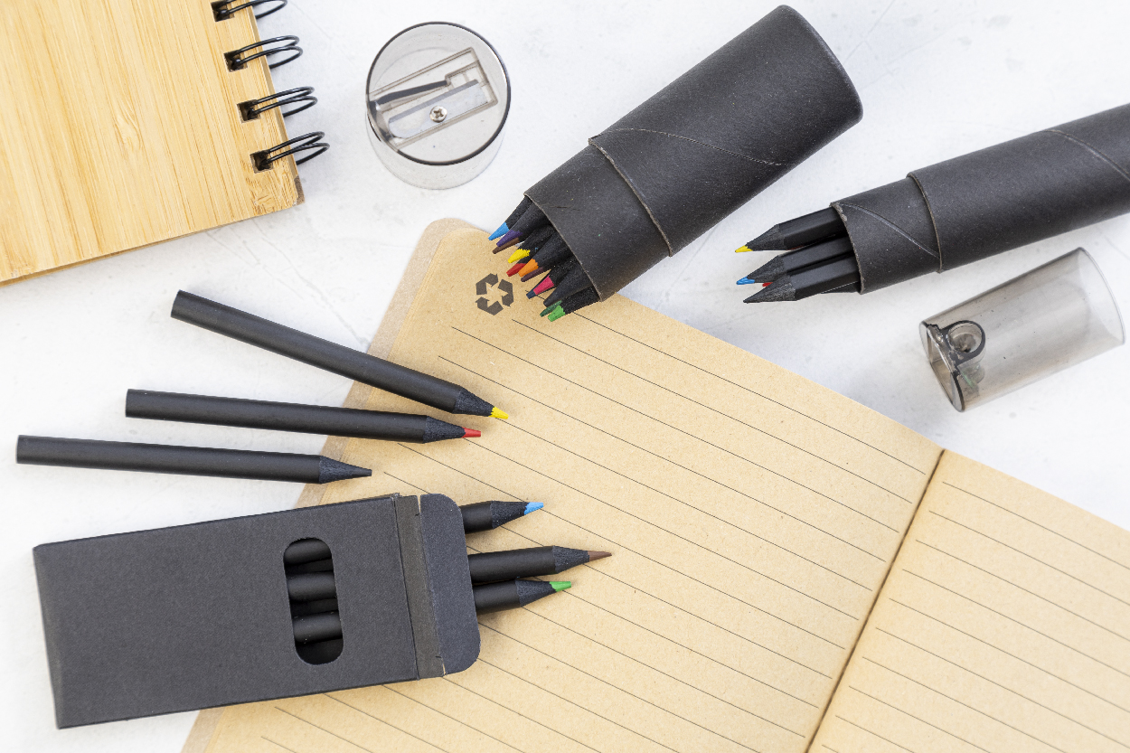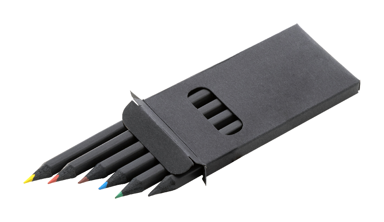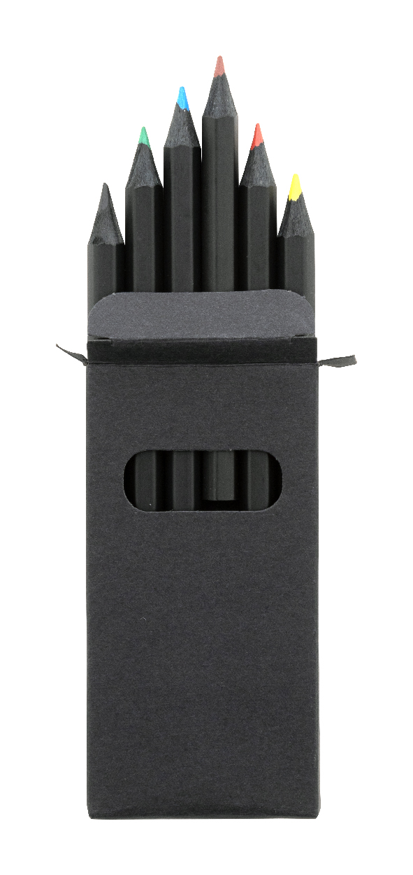 6dílná sada pastelek z černého dřeva v černé krabičce z papíru.