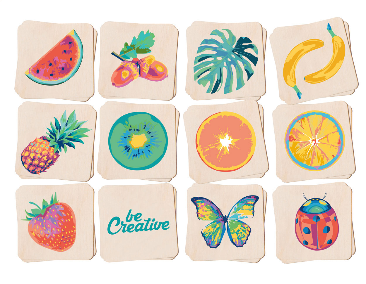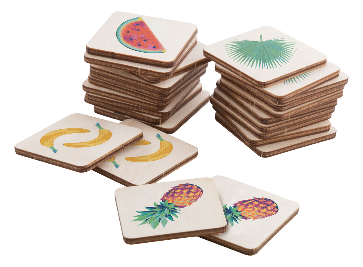 Pexeso z laminované březové překližky s vlastní grafikou. S 24 dlaždicemi (40x40 mm). Cena zahrnuje 12 různých plnobarevných potisků na přední straně dlaždic a identický plnobarevný potisk na zadní straně všech dlaždic. Cena nezahrnuje tiskovou přípravu. Min. mn.: 250 ks.