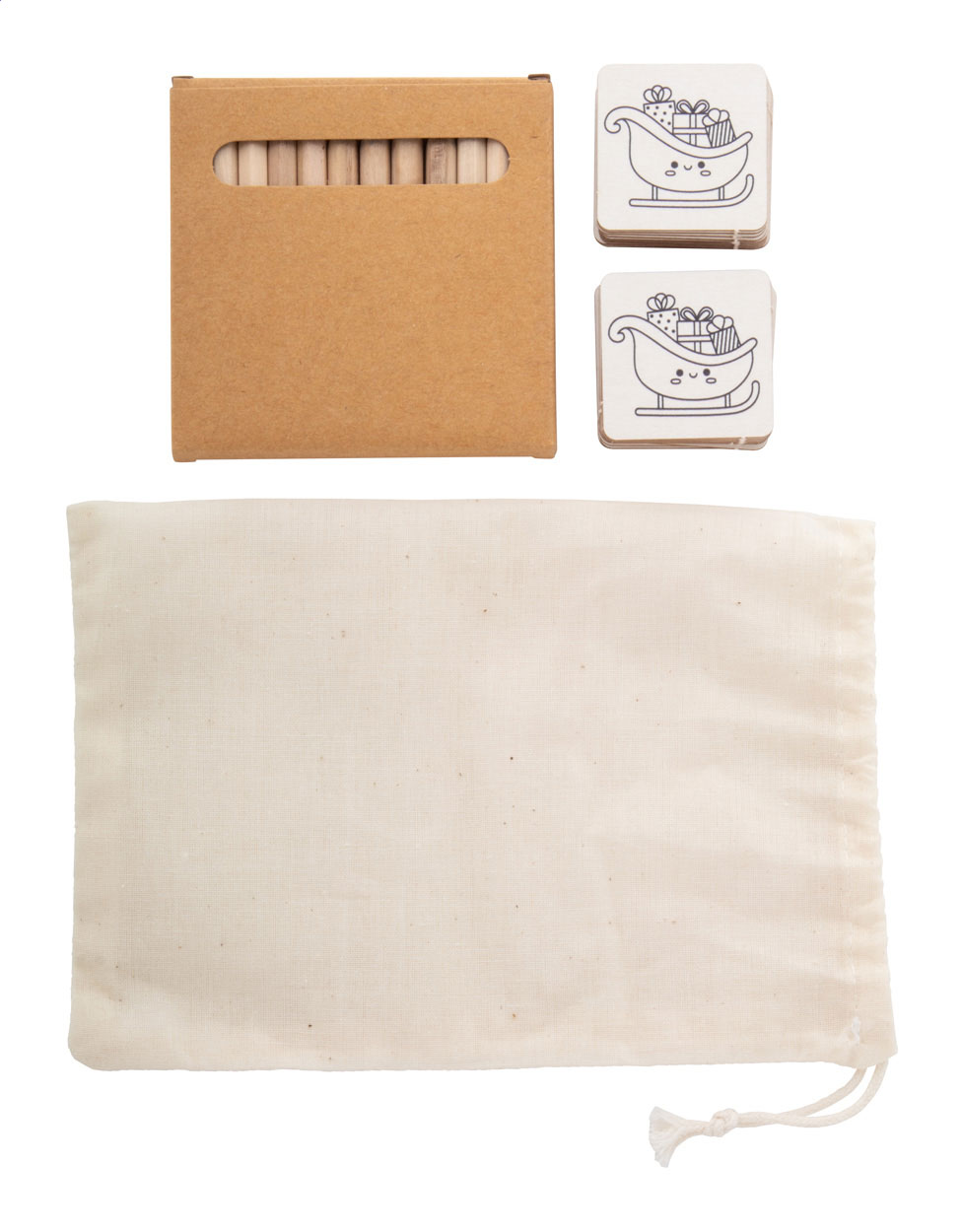 Vánoční omalovánky v bavlněném pouzdře. Obsahuje papírové pexeso (24 dílků) s vánočními motivy a dřevěné barevné tužky (12 ks) v papírové krabičce.