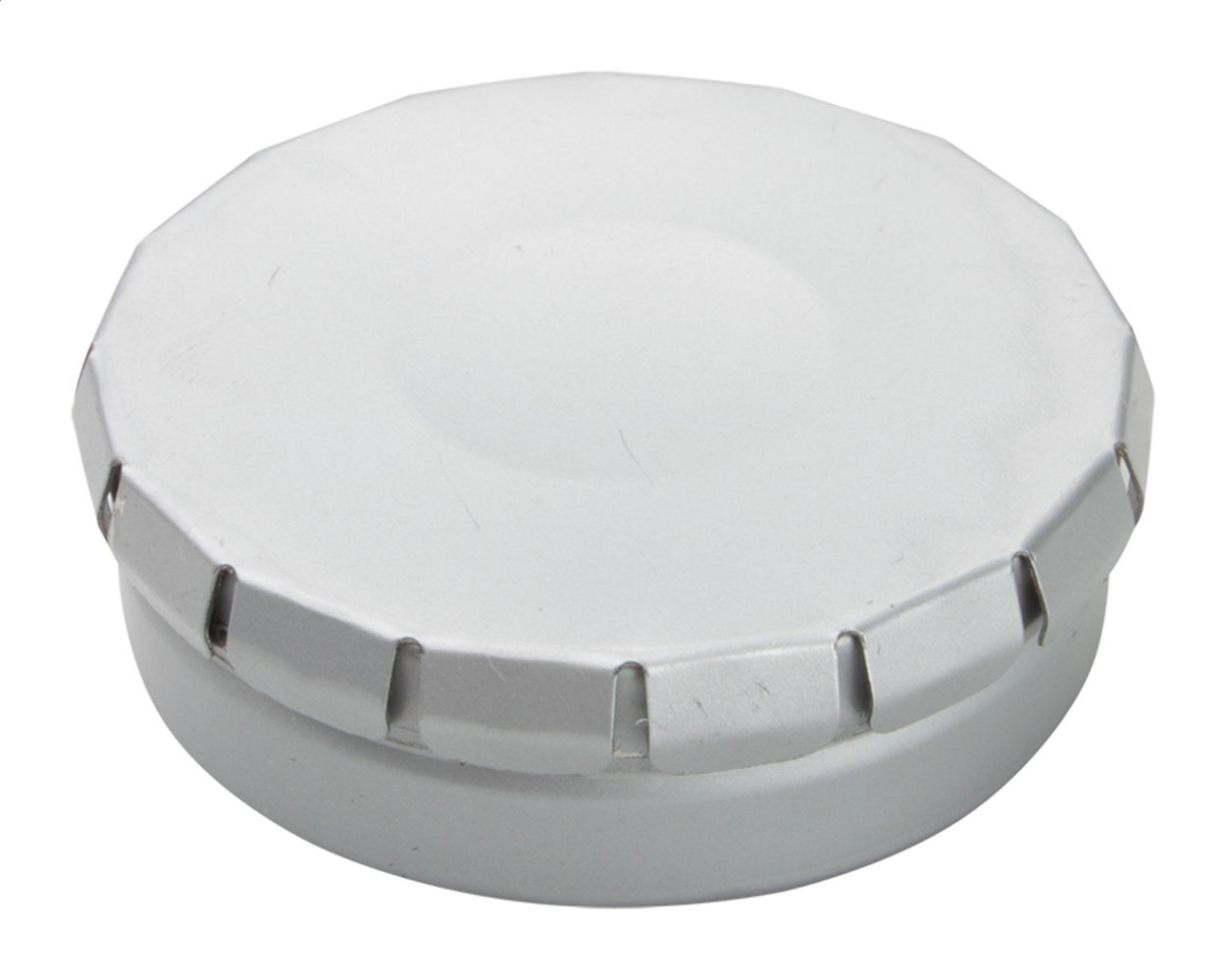 Kulatá, kovová krabička s cca. 12 gramů mentolových bonbonů. Lze otevřít stisknutím víčka.