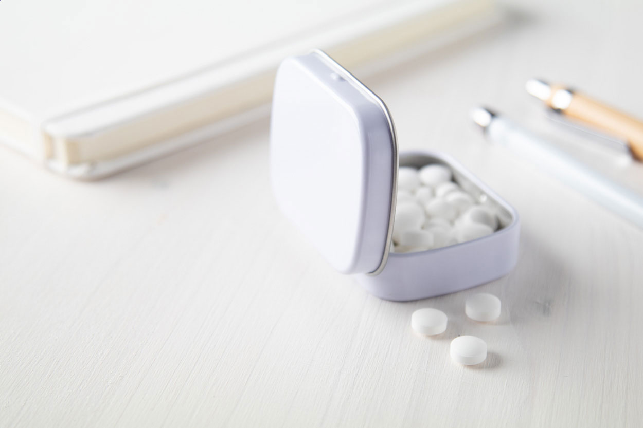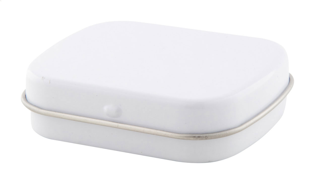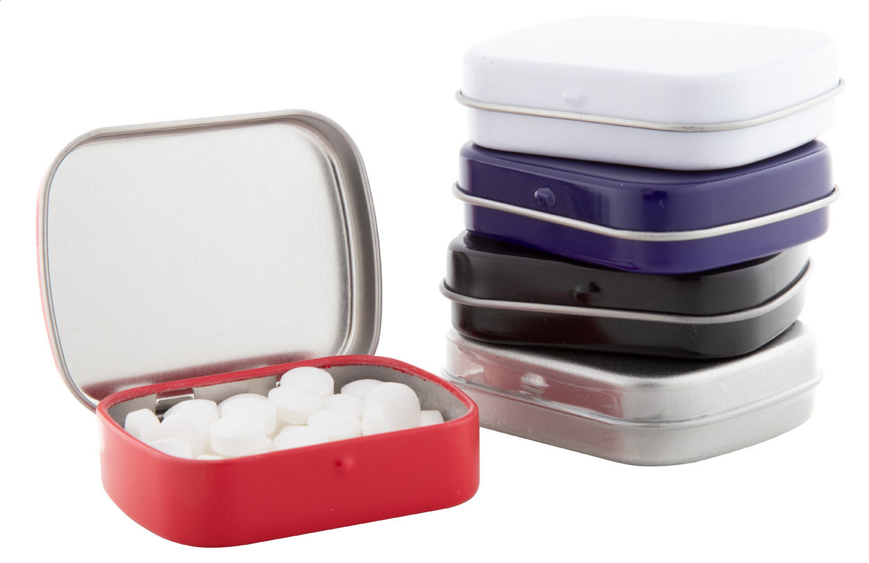 Obdélníková kovová krabička s cca. 25 gramů mmentolových bonbónů.