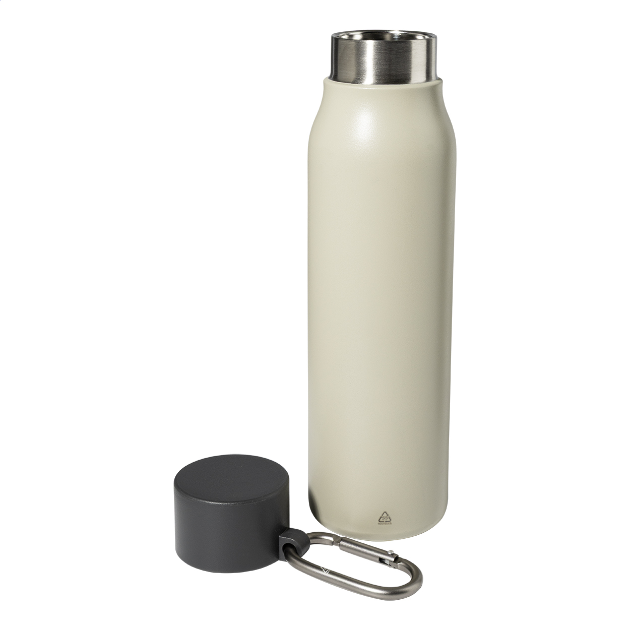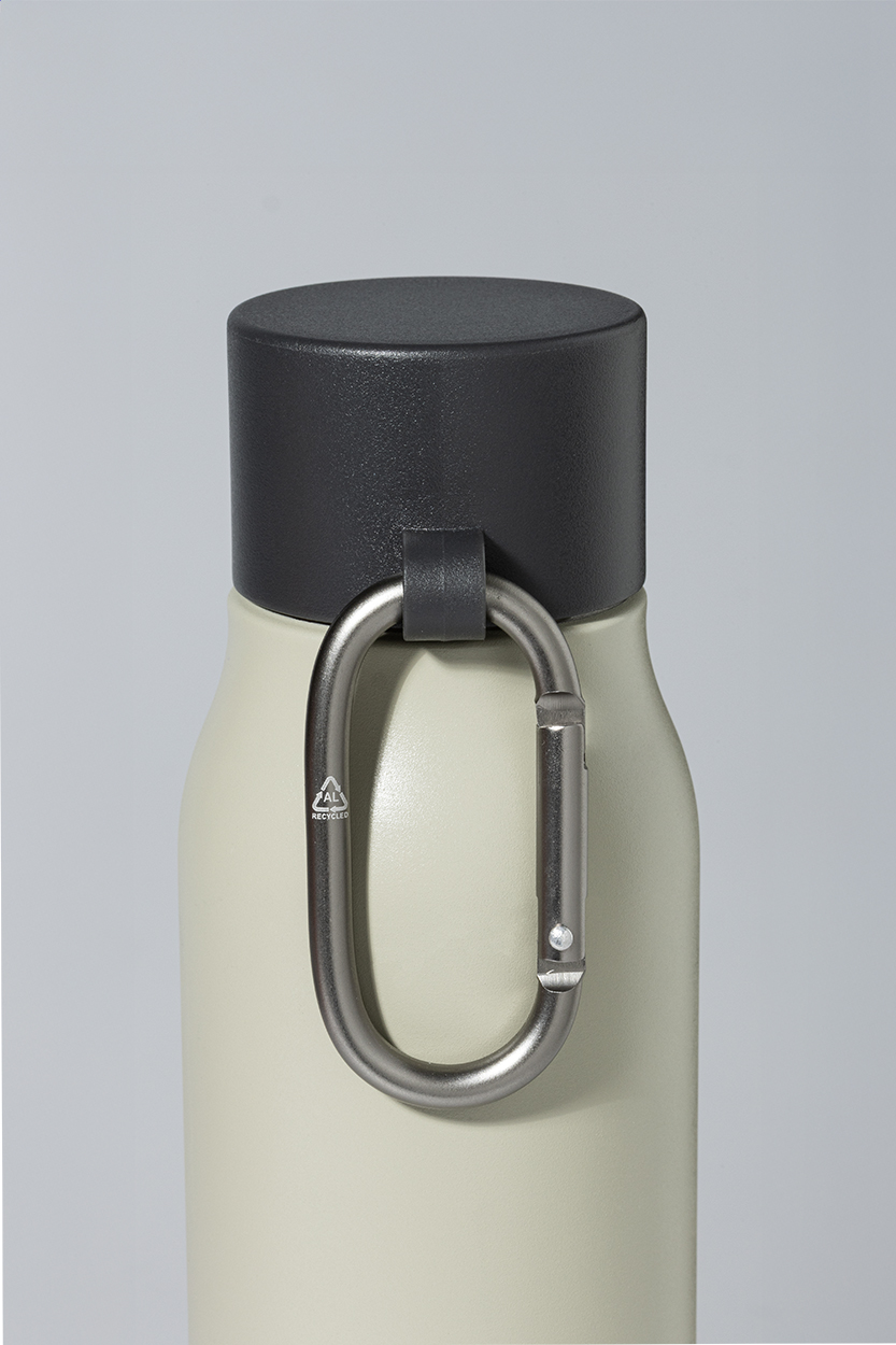Dvoustěnná vakuová láhev z recyklované nerezové oceli s víčkem z PP a karabinou z recyklovaného hliníku. 500 ml.