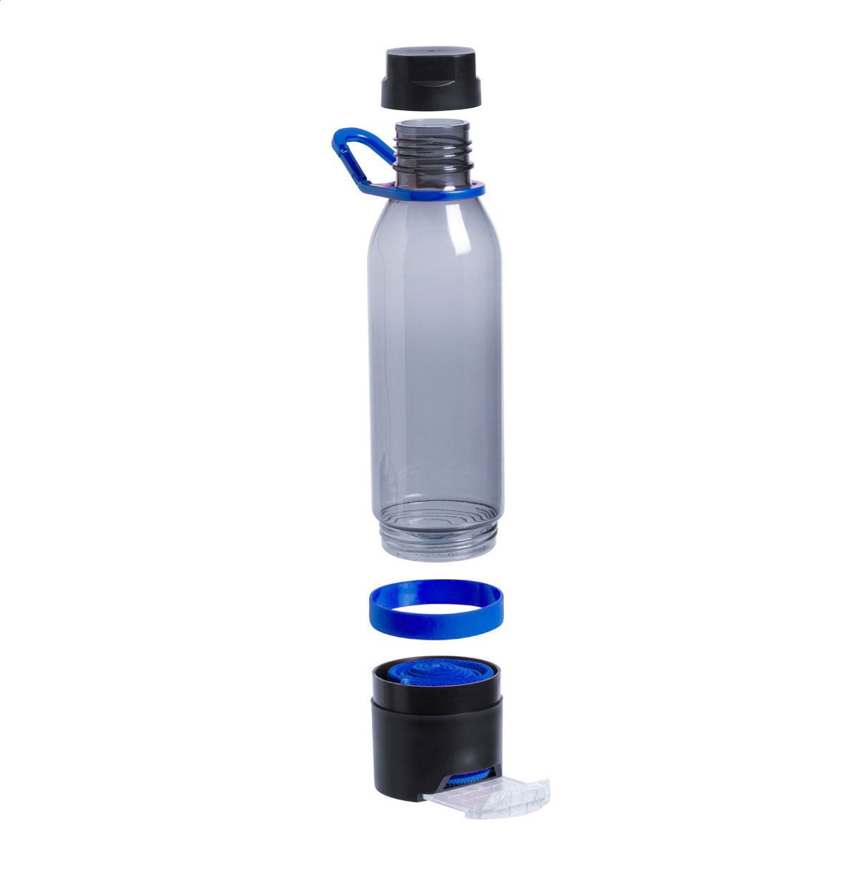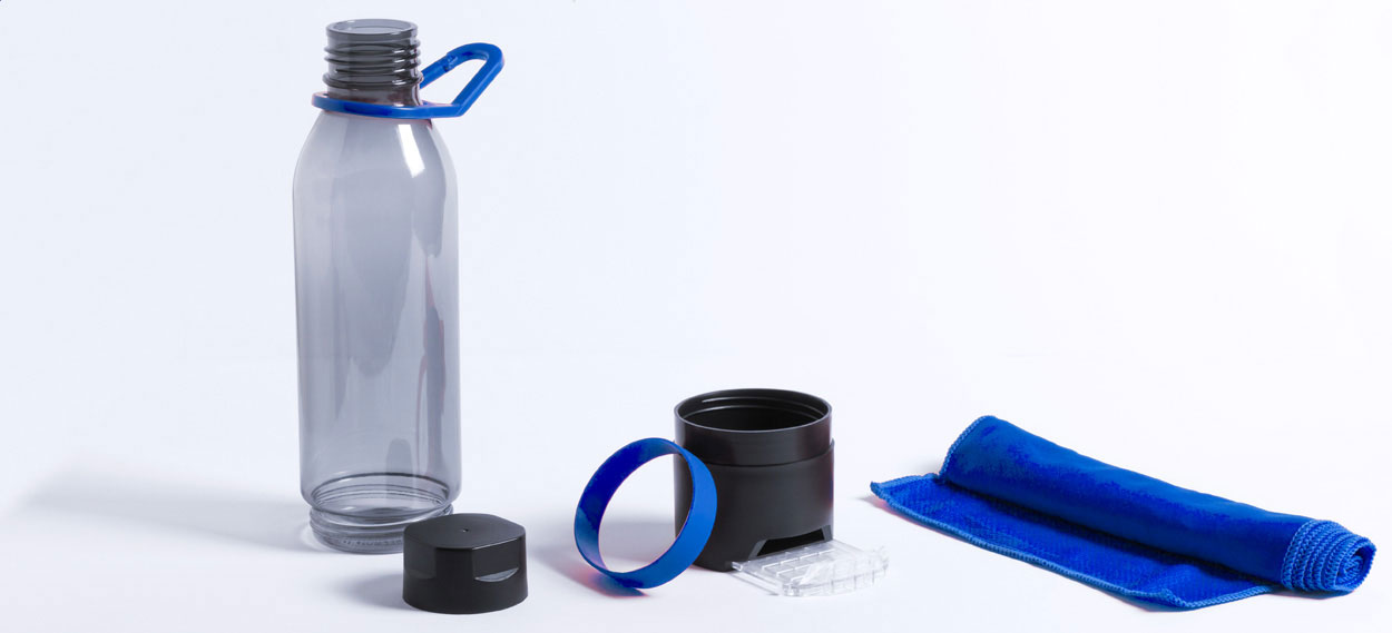 Plastová multifunkční sportovní láhev s chladicím ručníkem (390 g/m²) ve spodní přihrádce a výsuvným držákem na mobilní telefon. V dárkovém balení. Objem 650 ml. Není vhodná pro sycené nápoje.