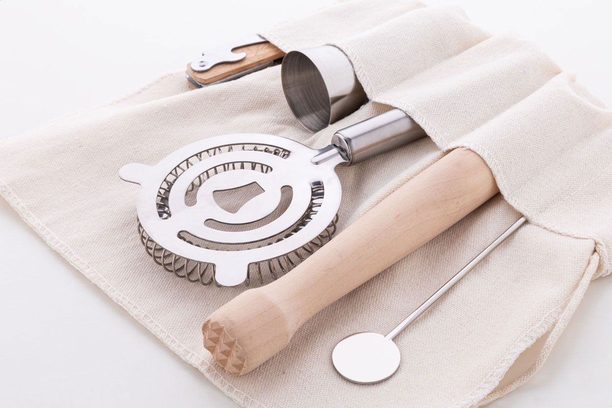 5dílná koktejlová sada v praktickém bavlněném sáčku. Včetně: nerezové odměrky, sítka a barové lžíce, vývrtky s bambusovou rukojetí a dřevěného tloučka.