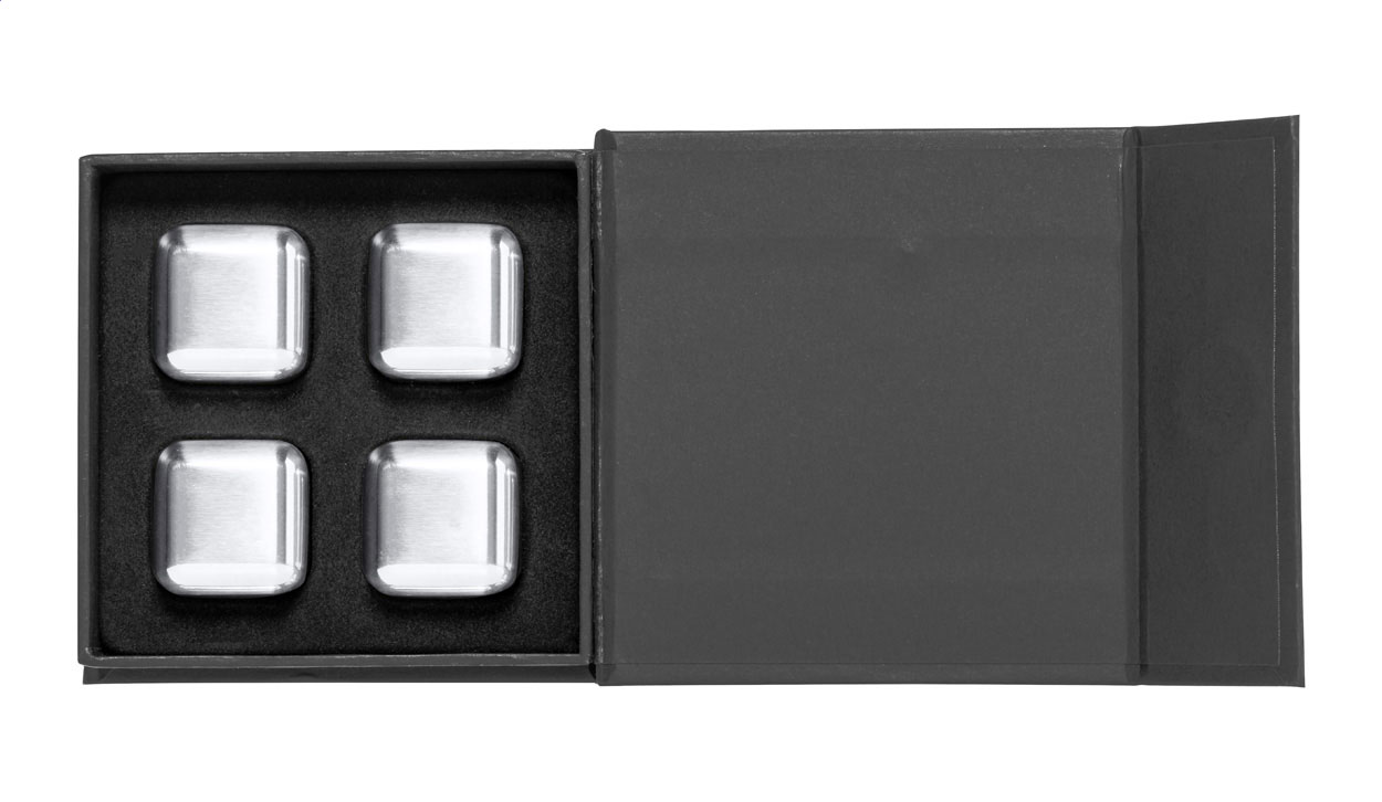 4dílná opakovaně použitelná sada chladících kostek z nerezové oceli v černé dárkové krabičce.
