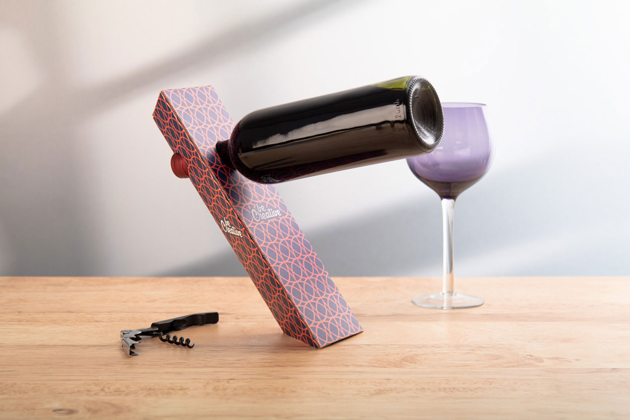 Na zakázku vyrobený, celobarevně potištěný gravitační držák na láhev vína z vlnité lepenky. Dodáváno rozložené. Cena nezahrnuje tiskovou přípravu. Min. mn.: 50 ks.