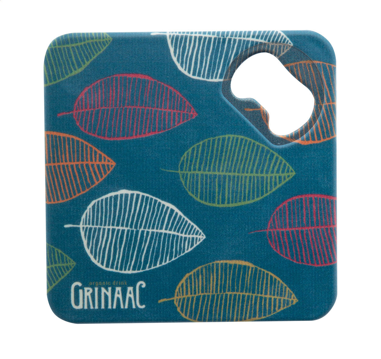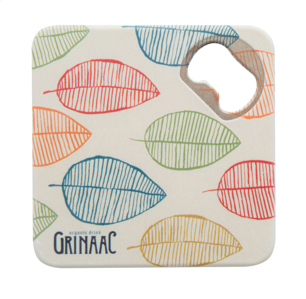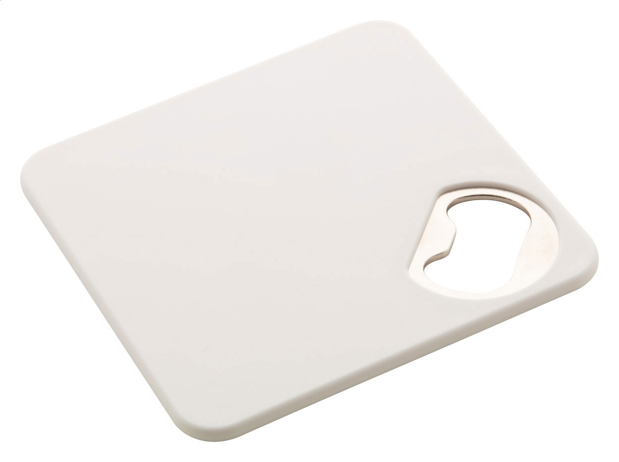 Plastový podtácek s kovovým otvírákem na láhve a protiskluzovým spodkem.