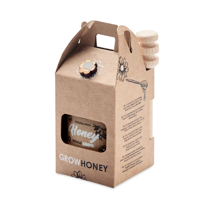 Sada sklenice medu z lučního kvítí (50 g) s dřevěnou naběračkou na med. Dodává se v kraftové papírové krabici. Včetně semínek lučního kvítí. Vyrobeno v EU.