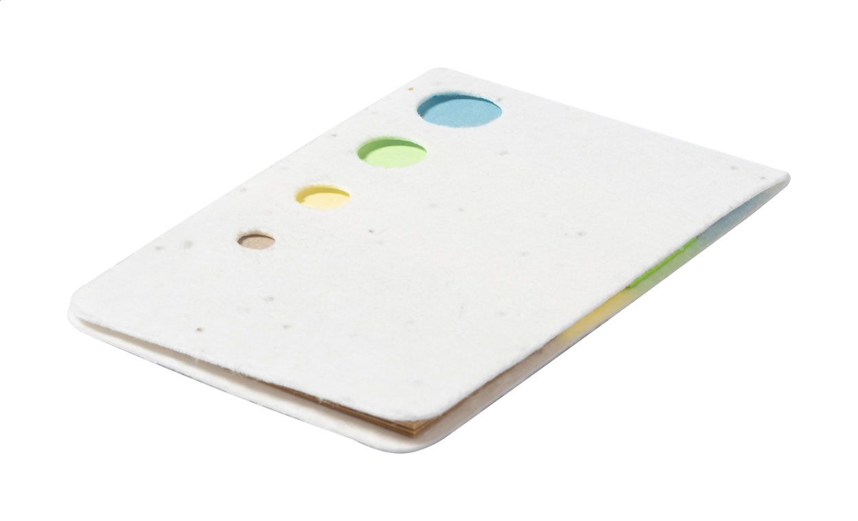Blok z recyklovaného papíru potažený papírem se semínky s 10 samolepícími lístky a 30 značkovači stránek (ve 3 různých barvách). Obal papíru se semínky obsahuje semena petúnie v různých barvách, která lze zasadit oddělením obalu od poznámkového bloku.