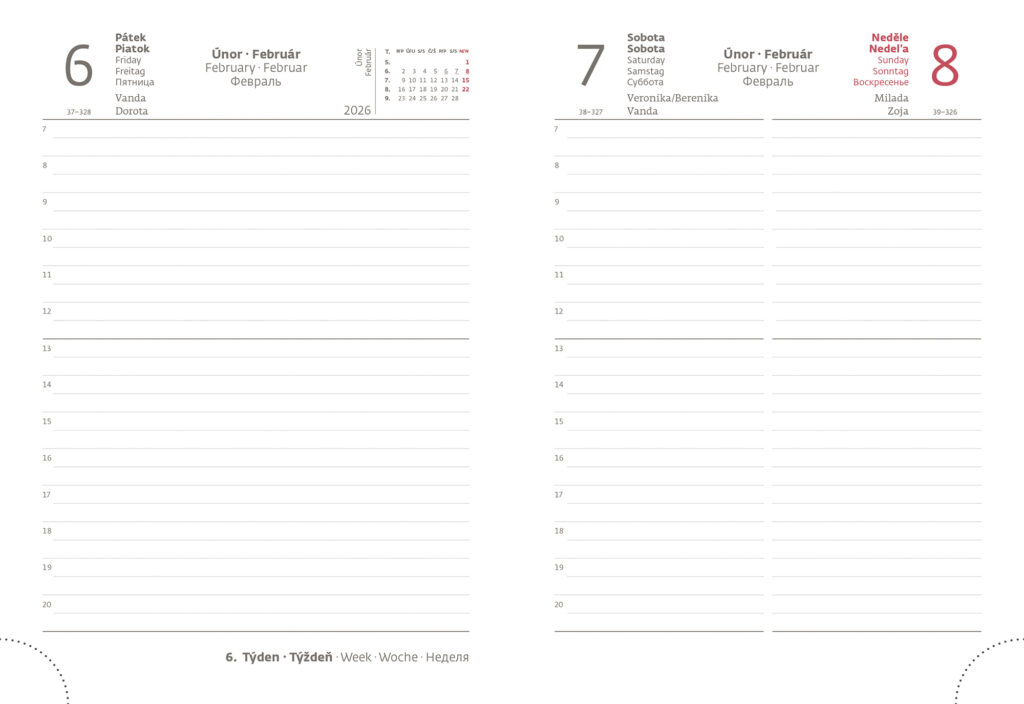 Diář Print. Matná koženka představuje kvalitní, na dotek příjemný a zároveň velmi oblíbený materiál. Tloušťka materiálu umožňuje dosáhnout perfektních výsledků při sleporažbě bez fólie. . . Diář obsahuje: osobní údaje, plánovač dovolené (měsíční přehled), plánovací kalendář, telefonní předvolby, státní svátky České a Slovenské republiky, mezinárodní svátky, roční výhled, denní layout, adresář, mapa Evropy a České a Slovenské republiky.