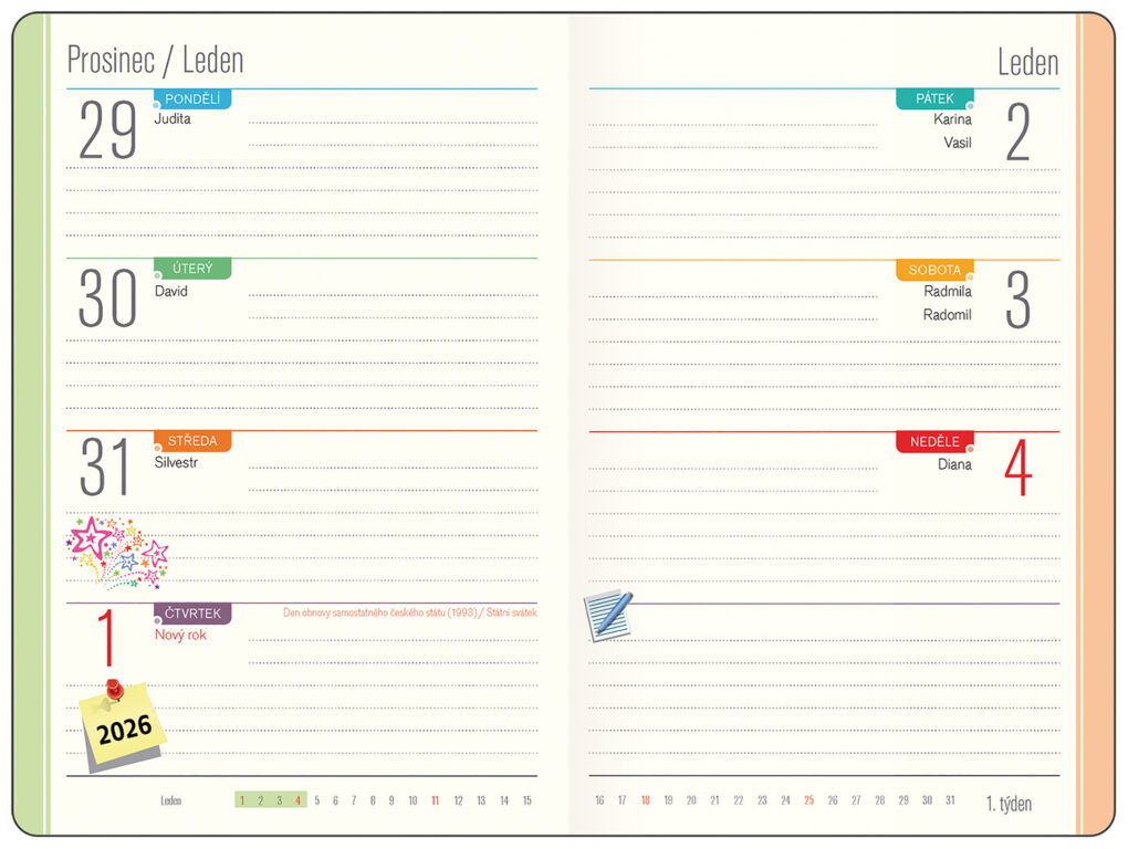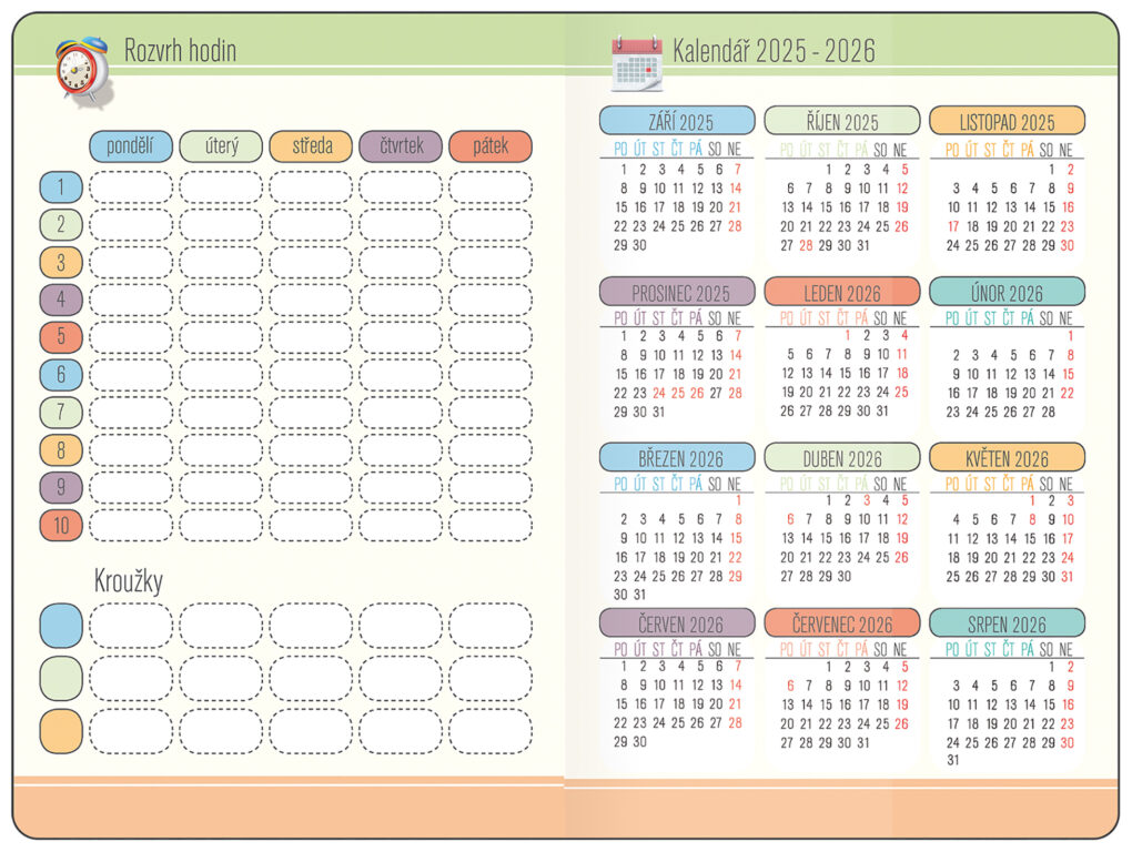 Studentský diář pro školní rok 2025/2026 o rozměrech 100 x 150 mm je praktickým pomocníkem pro každodenní organizaci.. Obsahuje české kalendárium, rozvrh hodin, adresář, přehled školních prázdnin a užitečné informace z předmětů jako matematika, chemie, fyzika a český jazyk, což usnadní přípravu na školní úkoly i plánování..