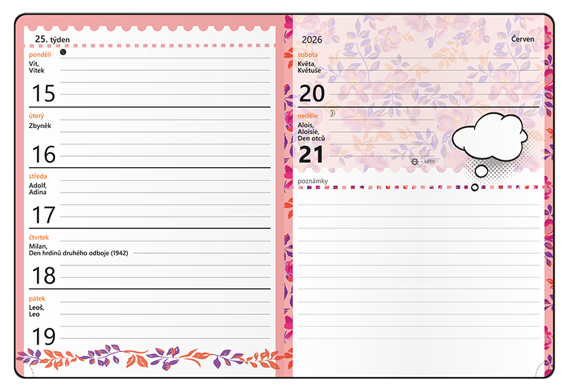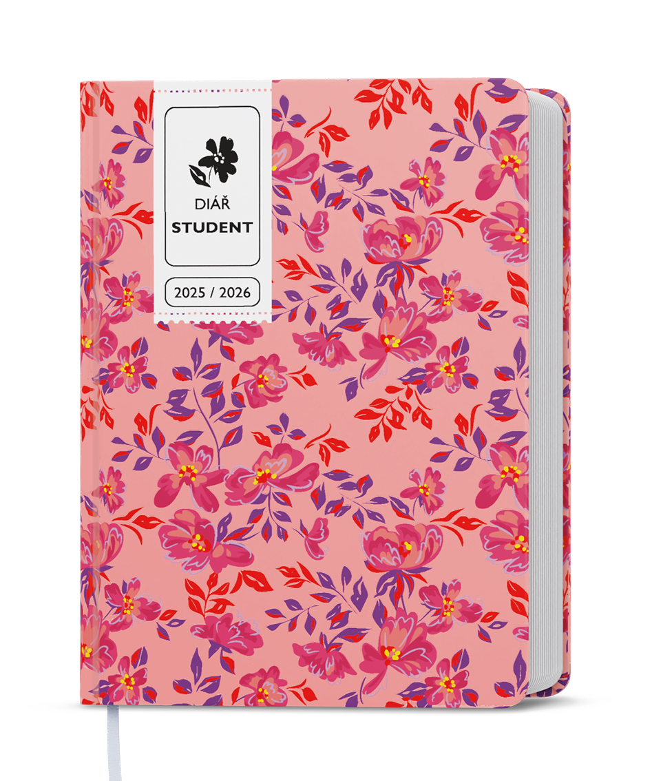 Tištěná grafika potažená nepoškrabatelným matným laminem s parciálním lakem, šitá vazba V8, stužka, perforované rožky, kulaté rohy