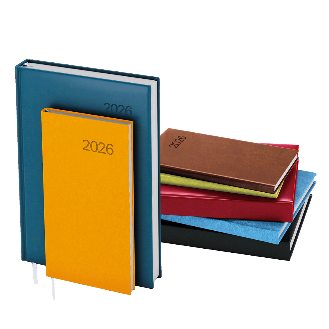 Jemný hladký materiál, ražba roku, šitá vazba V8, stužka, perforované rožky, ofset, 70g/m2