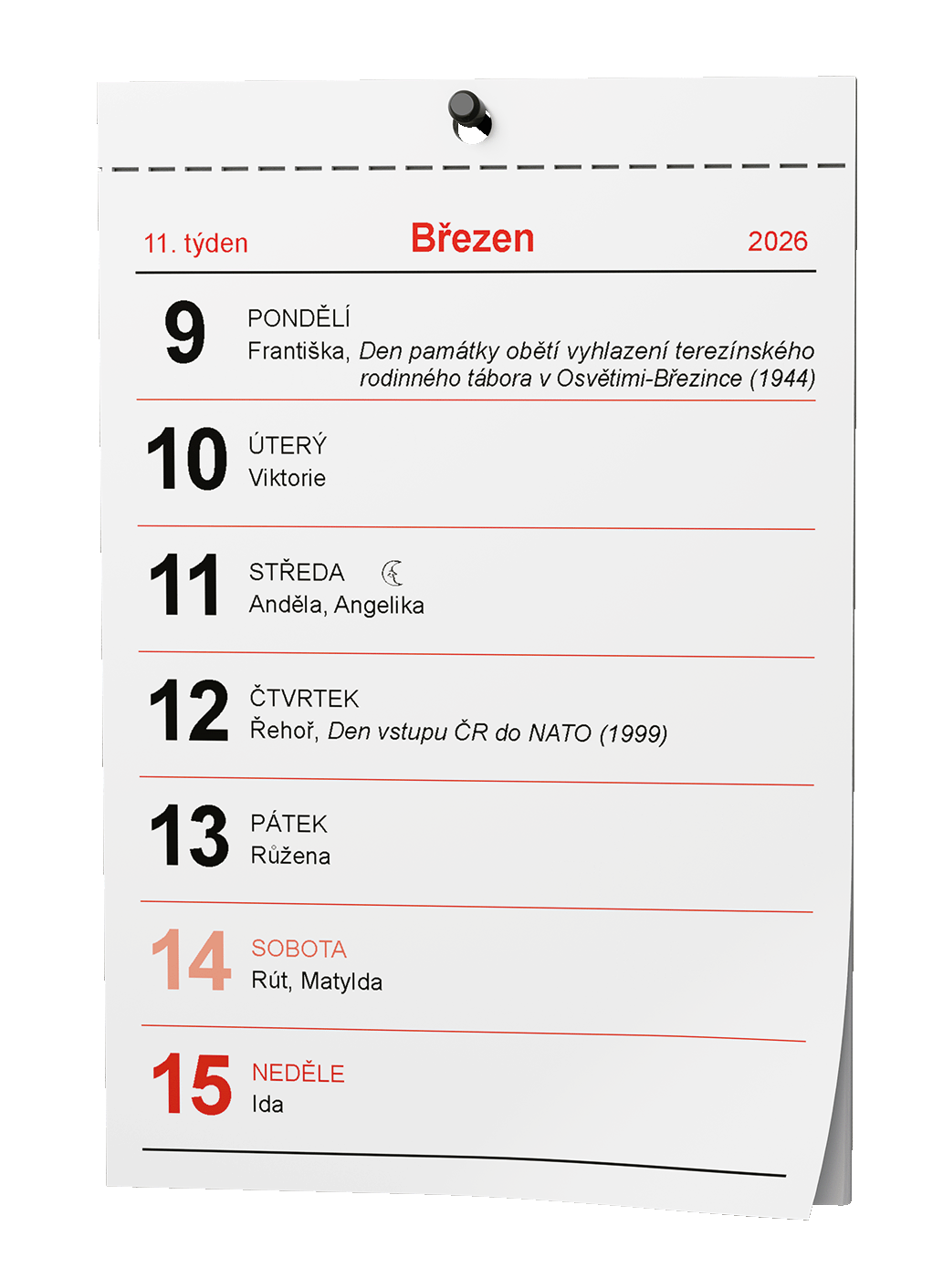 Trhací nástěnný kalendář s týdenním kalendáriem a většími písmeny a čísly ve formátu A6.