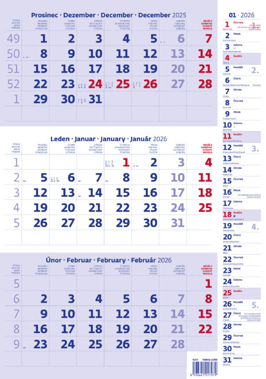 Tříměsíční kalendář modrý s poznámkami 2026. Vyrobeno v ČR.