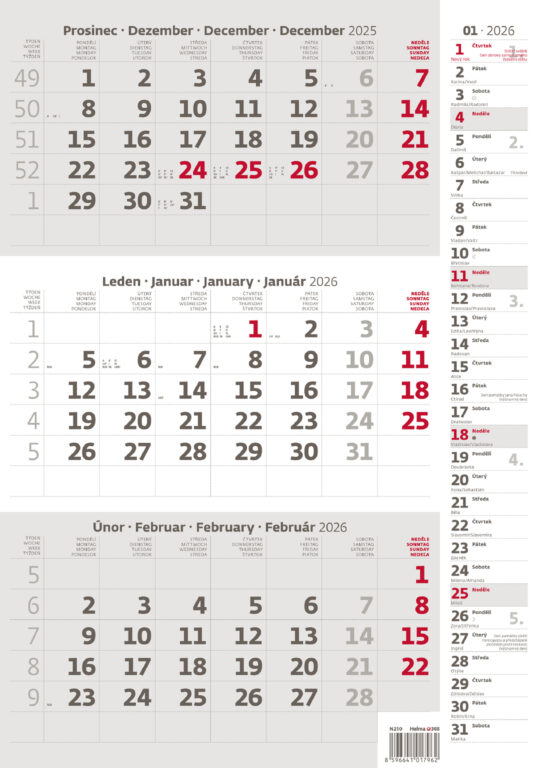 Tříměsíční kalendář šedý s poznámkami 2026. Vyrobeno v ČR.