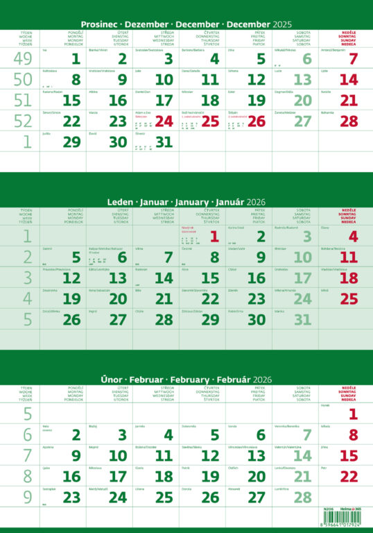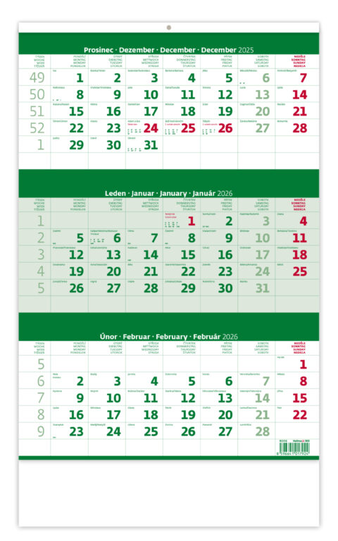 Tříměsíční kalendář zelený 2026. Vyrobeno v ČR.