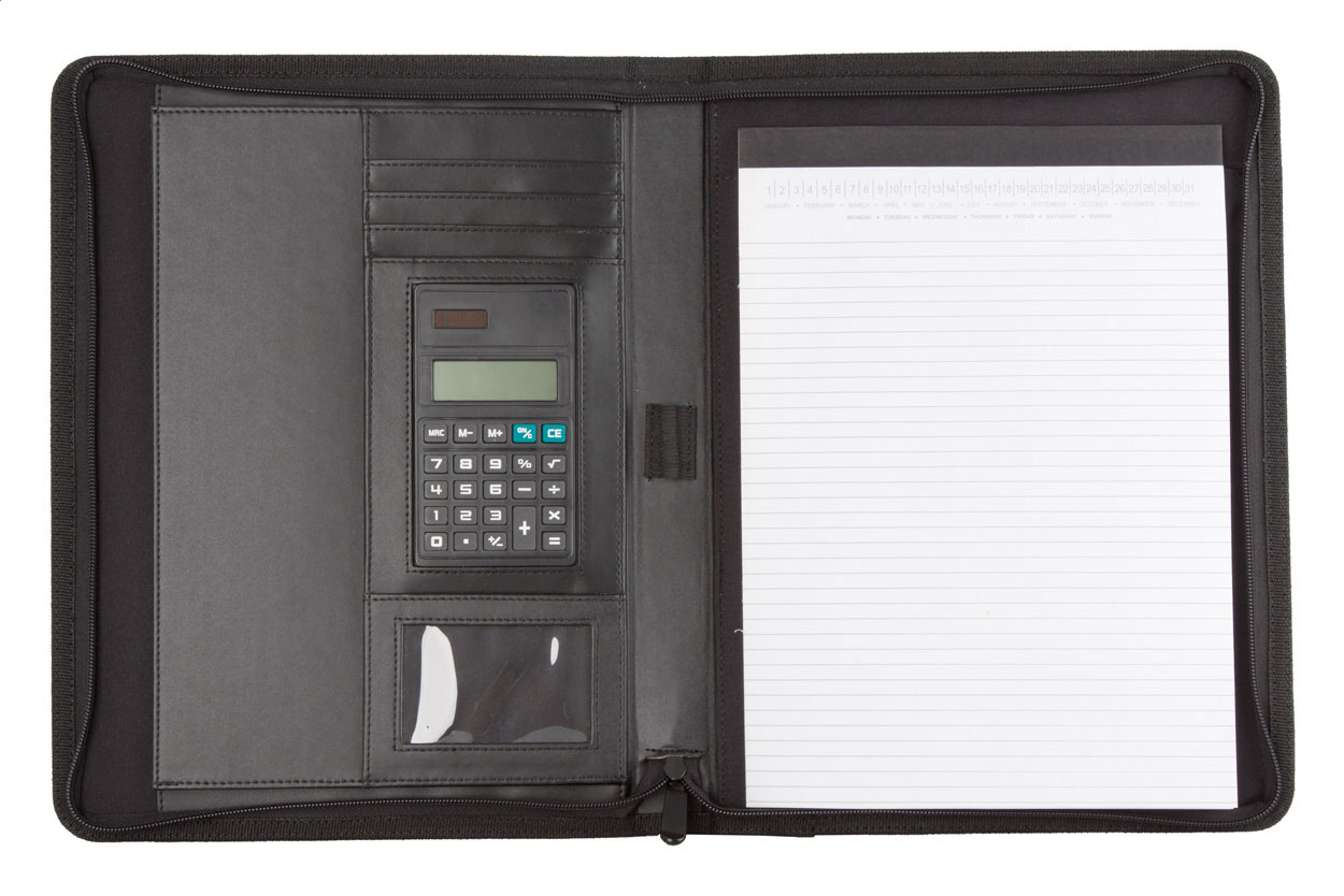 A4 sloha na dokumenty s deskami z PU kůže a plátna s kovovým štítkem, na zip s uchem a s 20 listým linkovaným blokem a solární kalkulačkou.
