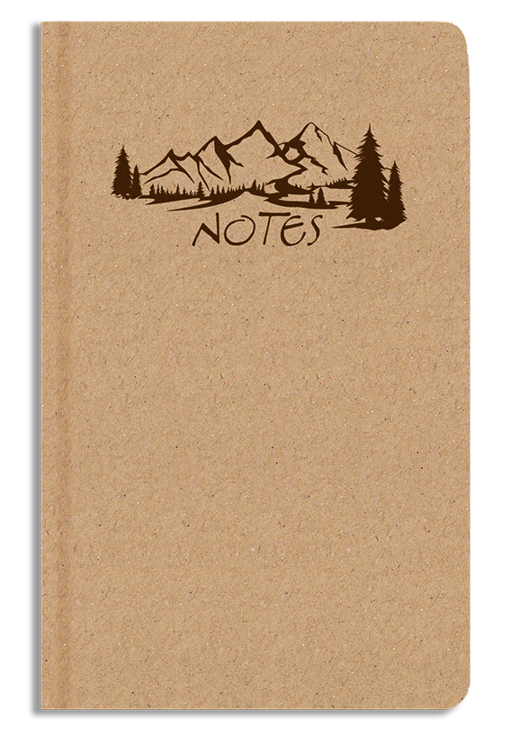 Notes A5 s krásnou grafikou hor na kraftové obálce.