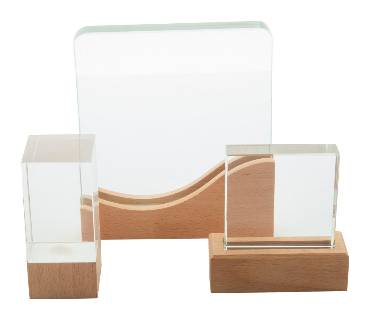 Skleněná trofej s podnoží z bukového dřeva. V kraftové dárkové krabičce.