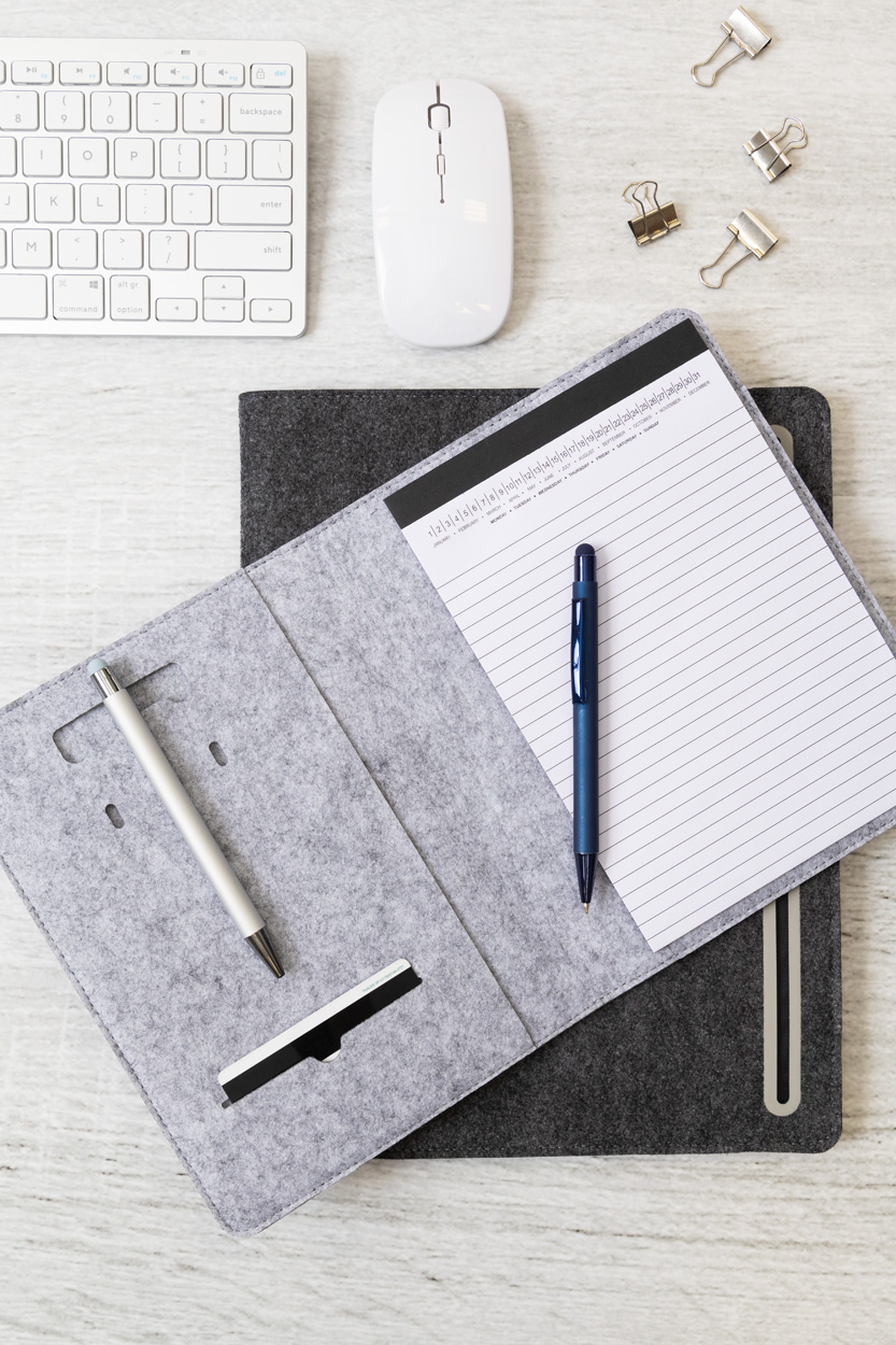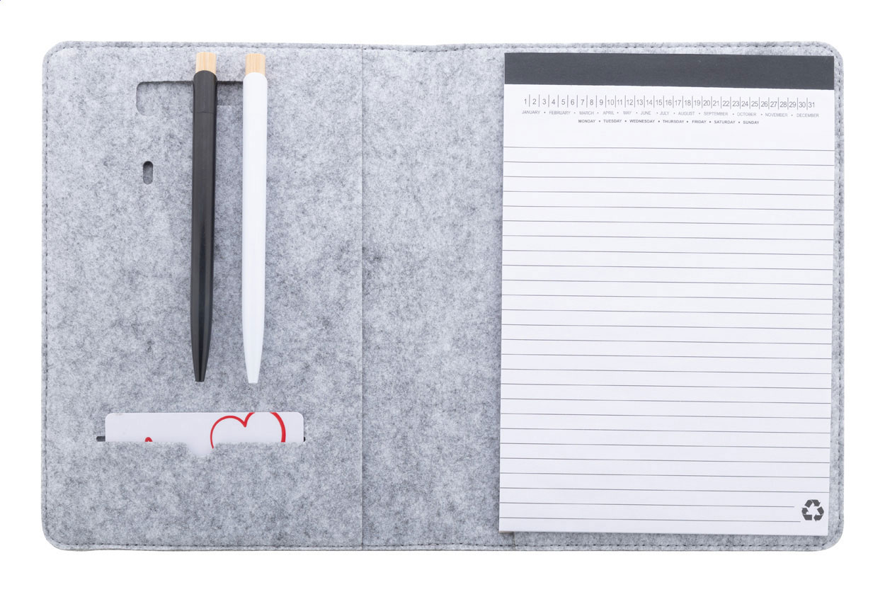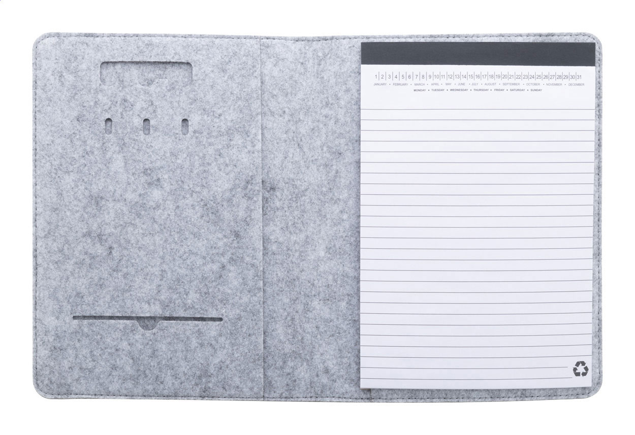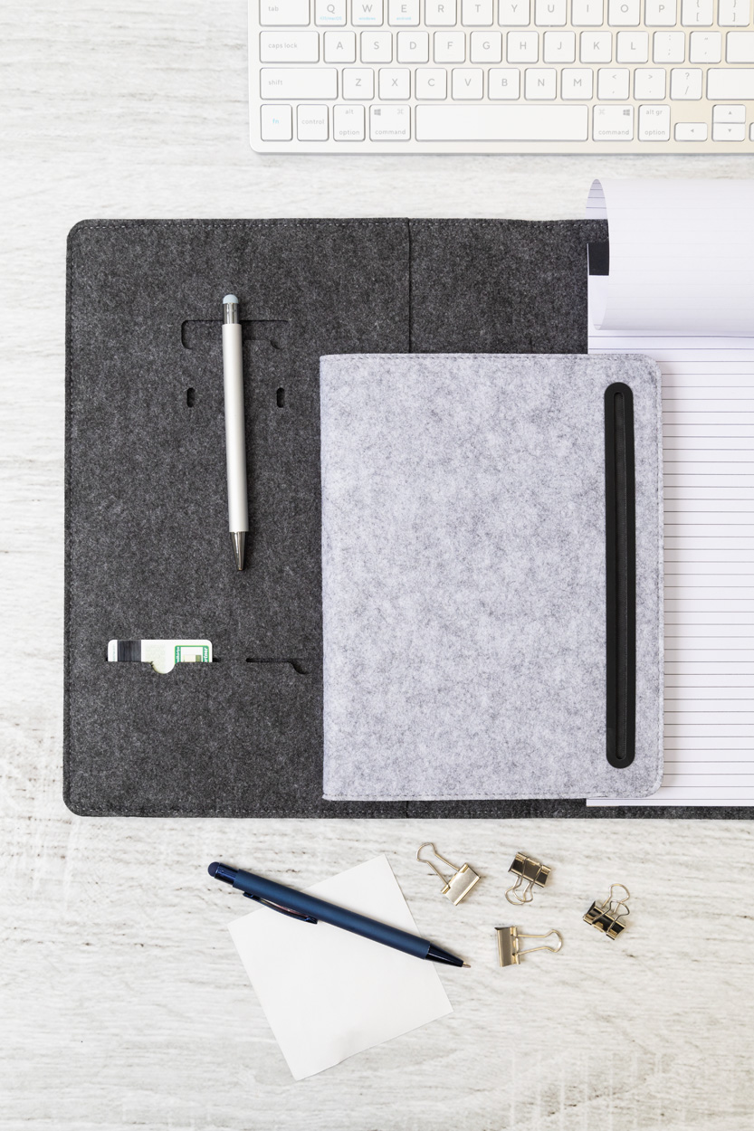 Plstěná sloha A5 na dokumenty z RPET formátu A5 s předními a několika vnitřními kapsami s organizérem. S 20 linkovanými listy poznámkového bloku z recyklovaného papíru.