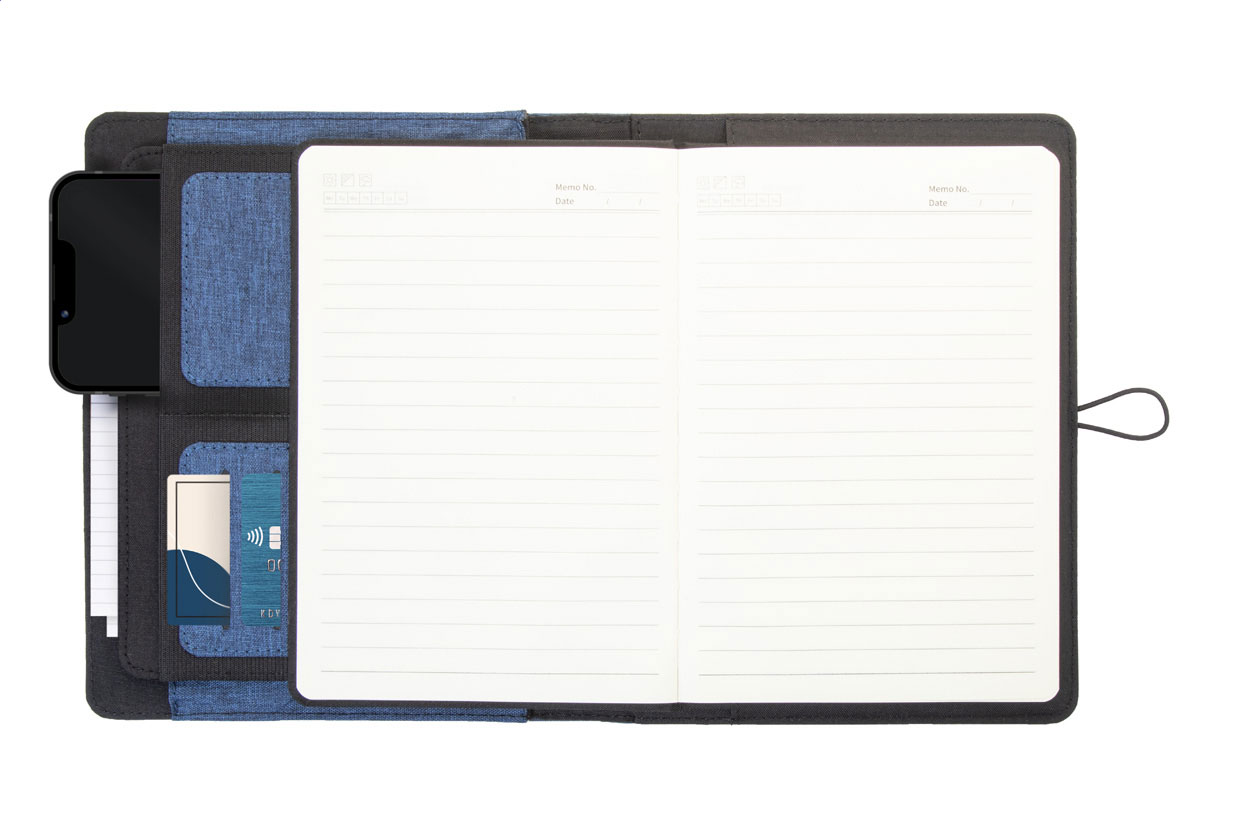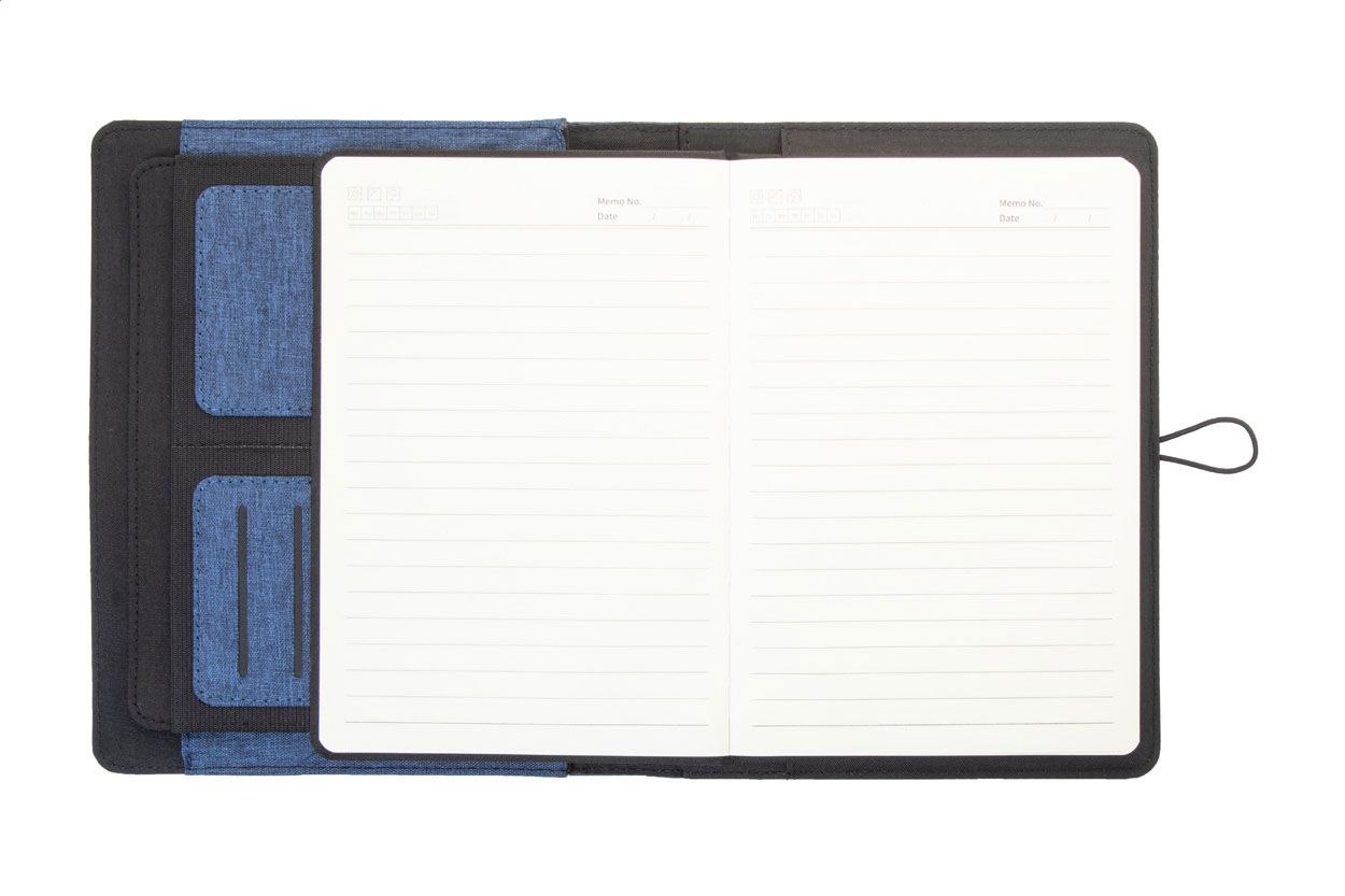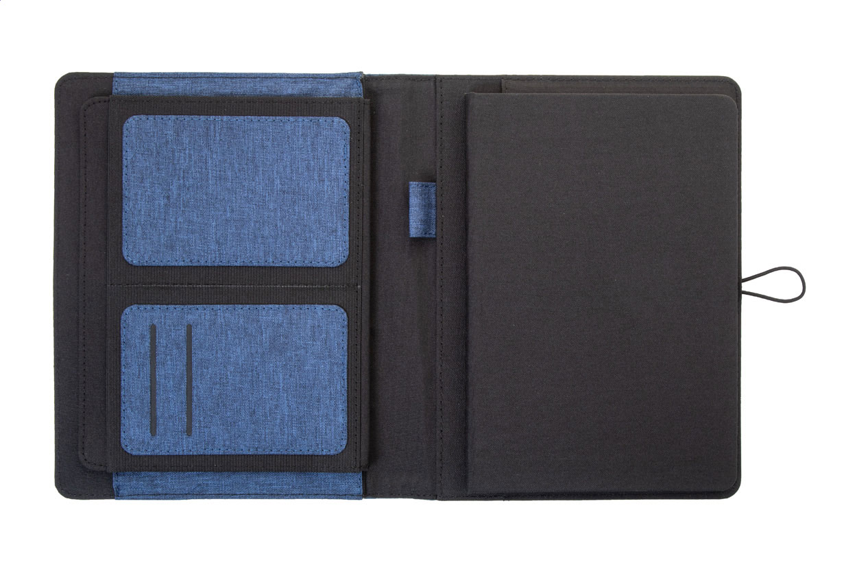 Polyesterová složka na dokumenty A5 z 300D RPET s 64 linkovaným poznámkovým blokem a několika vnitřními kapsami s organizérem.
