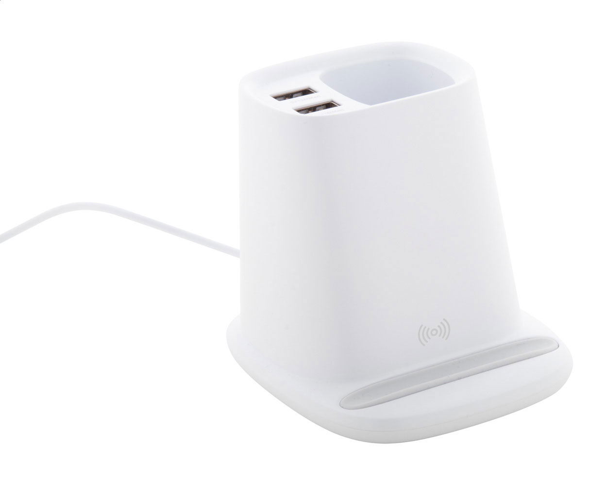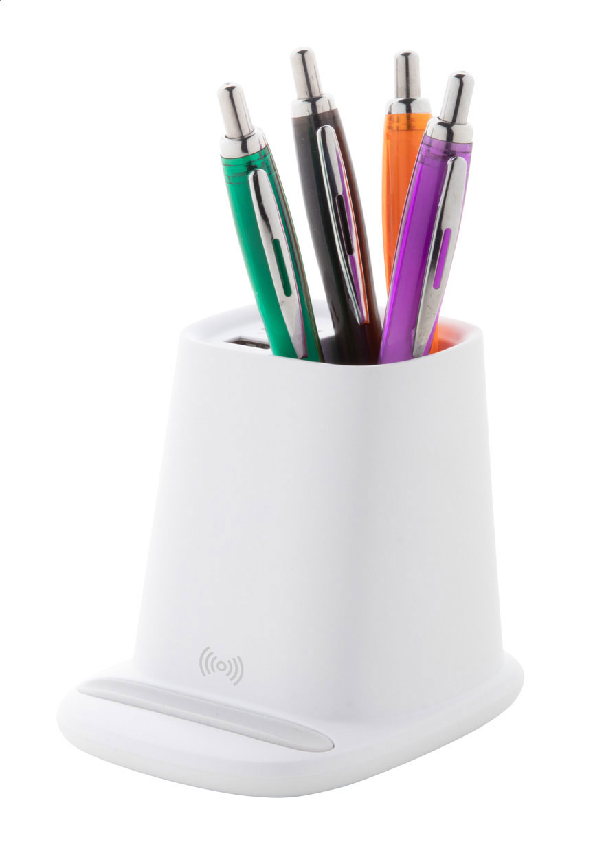 Multifunkční plastový stojánek na pera s držákem na telefon, vestavěnou bezdrátovou rychlonabíječkou (10W) a 2 porty USB nabíječky (max. výstup 2000 mA). Včetně USB nabíjecího kabelu.