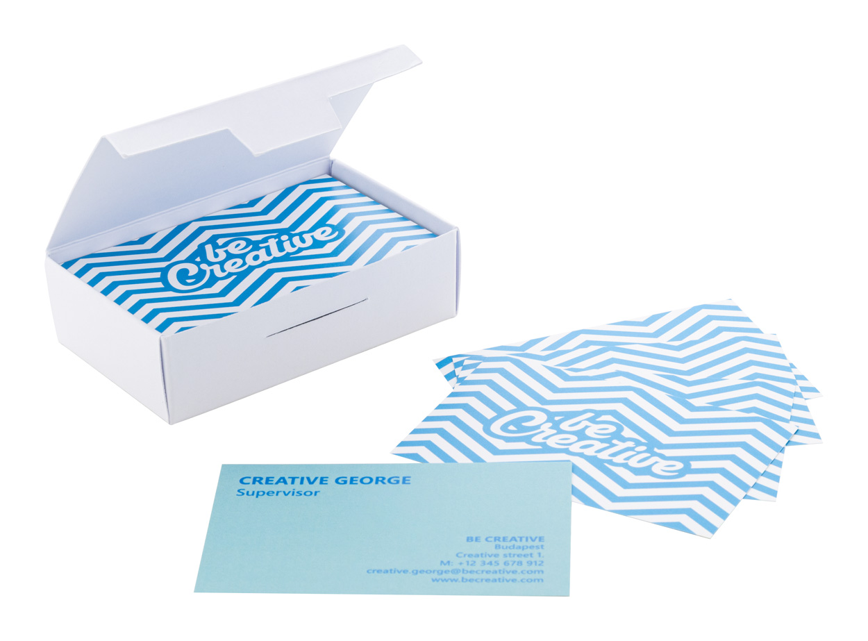 100 ks vizitek z papíru odolného proti roztržení, vyrobených na zakázku, s plnobarevným potištěným grafickým potiskem na obou stranách, cena nezahrnuje tiskovou přípravu. V bílé papírové krabičce. Uvedená cena se vztahuje na jednu krabičku vizitek obsahující 100 ks.