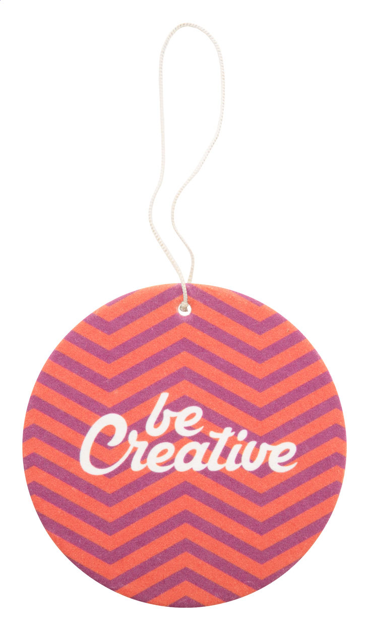 Aromatická visačka do auta na zakázku s výběrem z 9 tvarů a z 8 vůní (exotický, čerstvý, zelené jablko, citron, nové auto, broskev, jahoda, vanilka). Potištěno až 4 barvami na každé straně. Zcela vlastní tvar je možný za příplatek. Min. mn.: 250 ks.