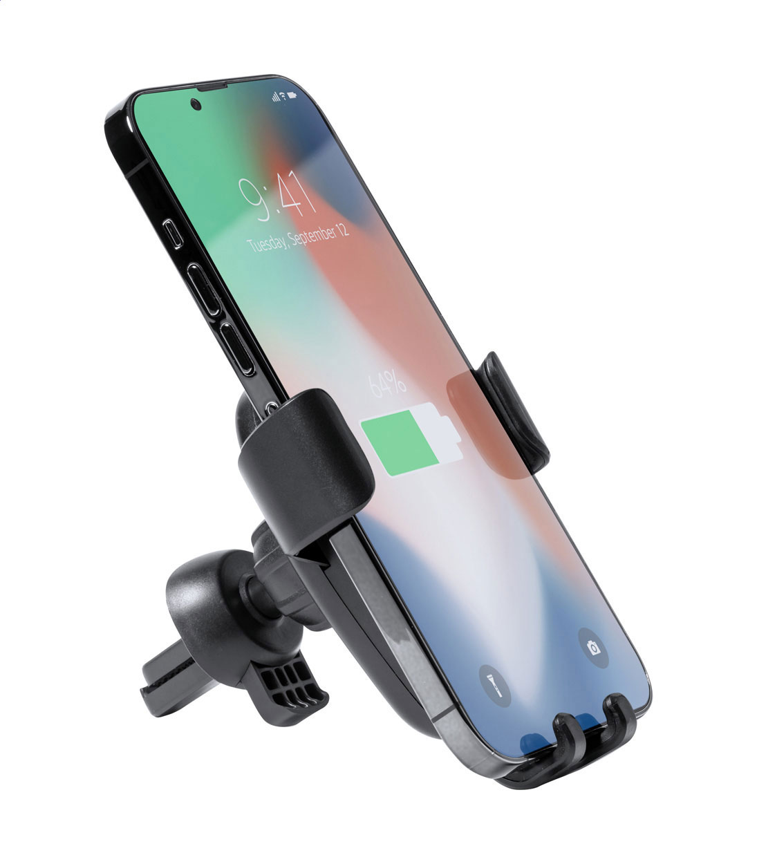 Držák na mobil do auta z ABS plastu se zabudovanou bezdrátovou rychlonabíječkou (10W) a nastavitelným uchycením do větracího otvoru. Včetně USB nabíjecího kabelu.