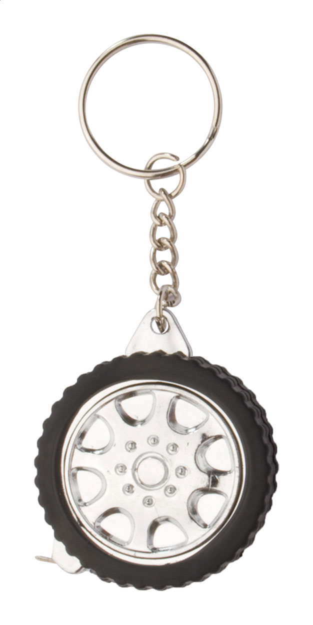 Přívěšek na klíče ve tvaru kola s metrem délky 1m, materiál guma a kov.
