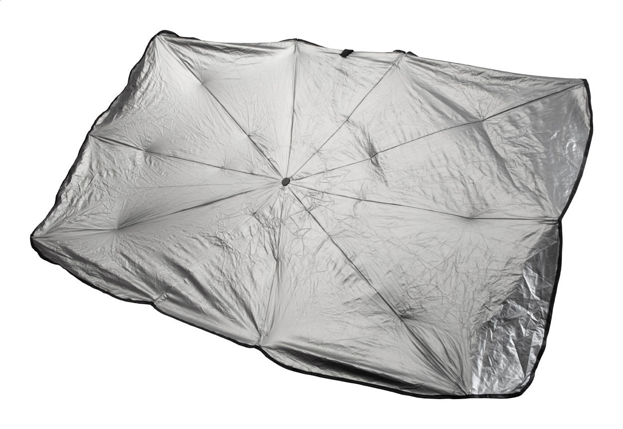 Skládací clona do auta na čelní sklo s kovovým rámem. V polyesterovém pouzdře.