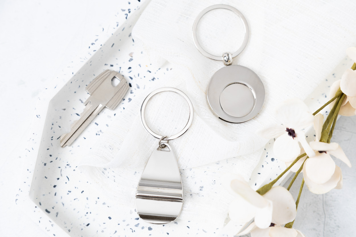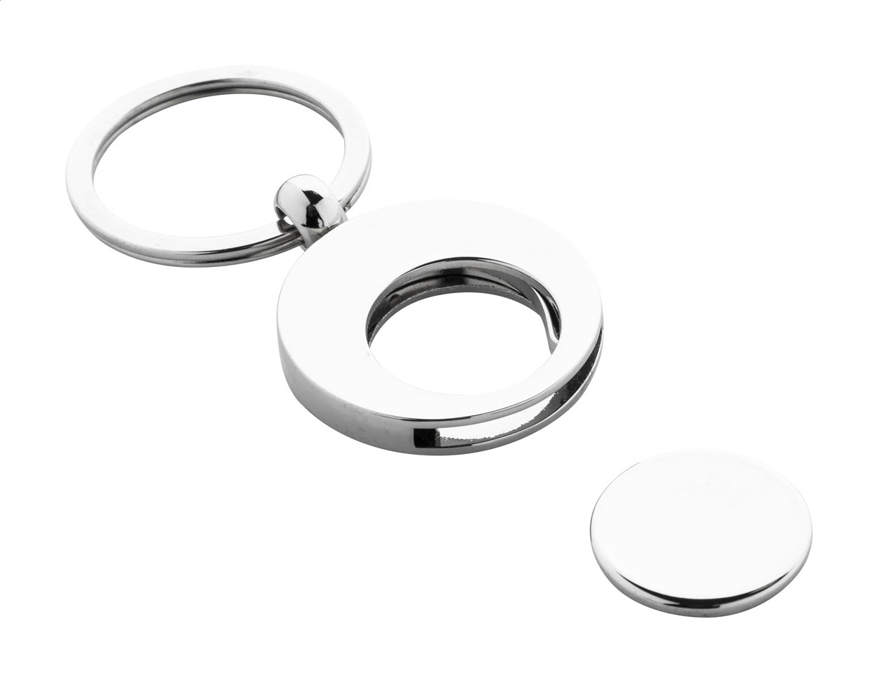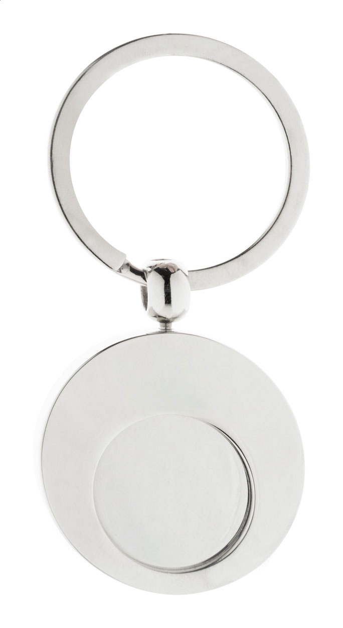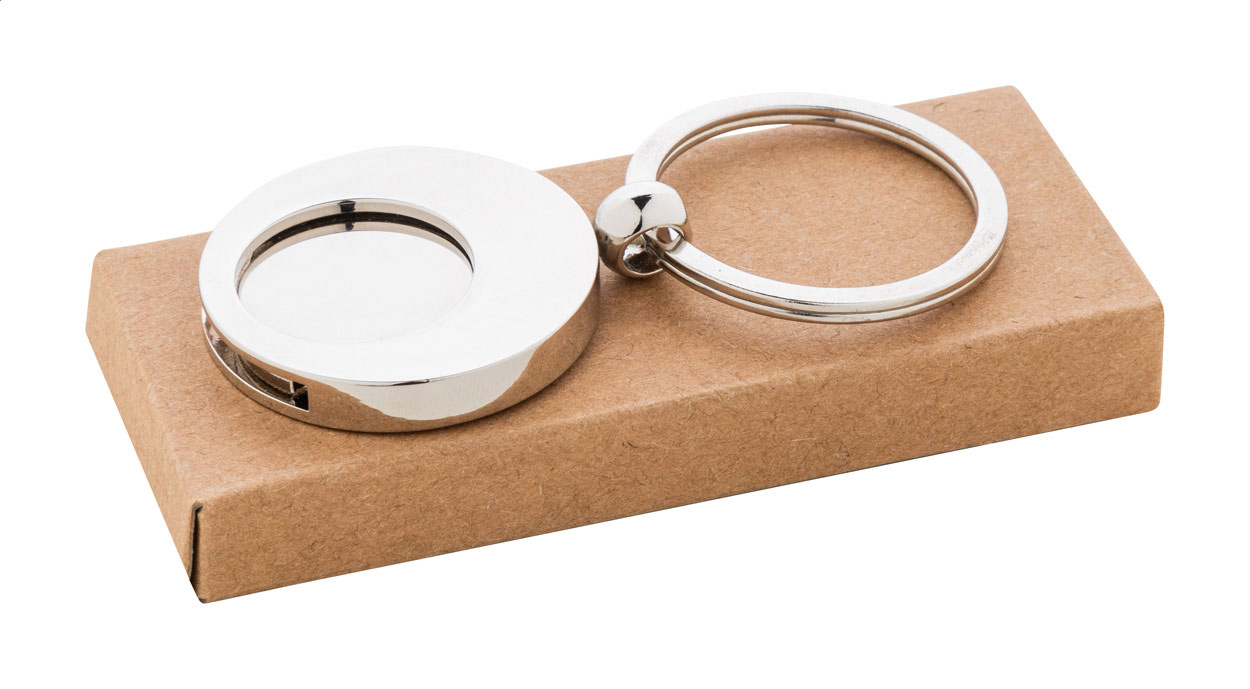 Kulatý kovový přívěsek na klíče se žetonem do nákupního vozíku. V kraftové papírové krabičce.