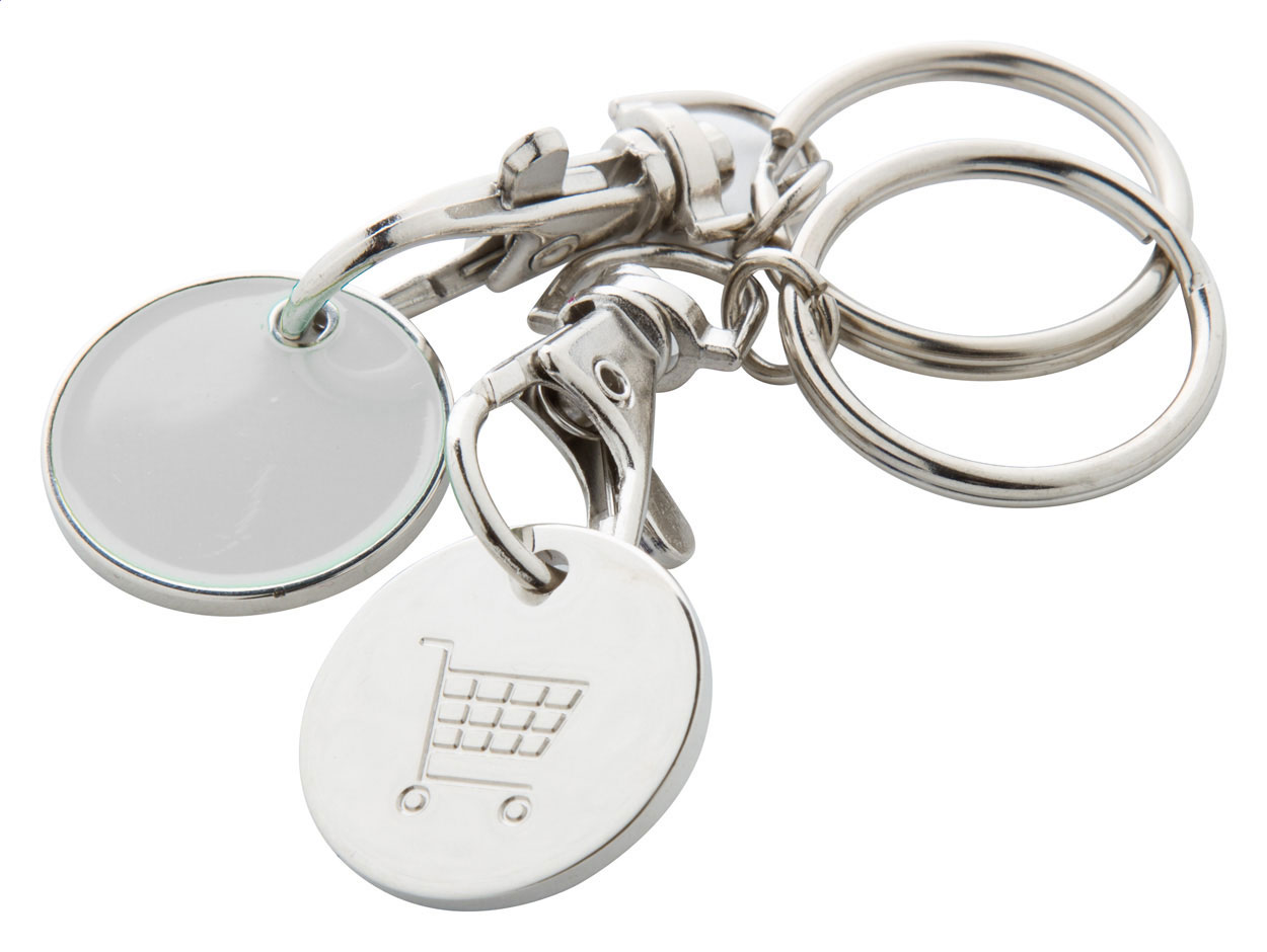 Kovový přívěšek na klíče se žetonem do nákupního košíku. Jedna strana mince je barevná, na druhé je vyražen nákupní vozík. Velikost: ø23×1,7 mm.