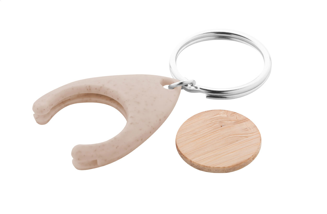 Bambusový žeton do nákupního vozíku v ekologické plastové klíčence z pšeničné slámy.