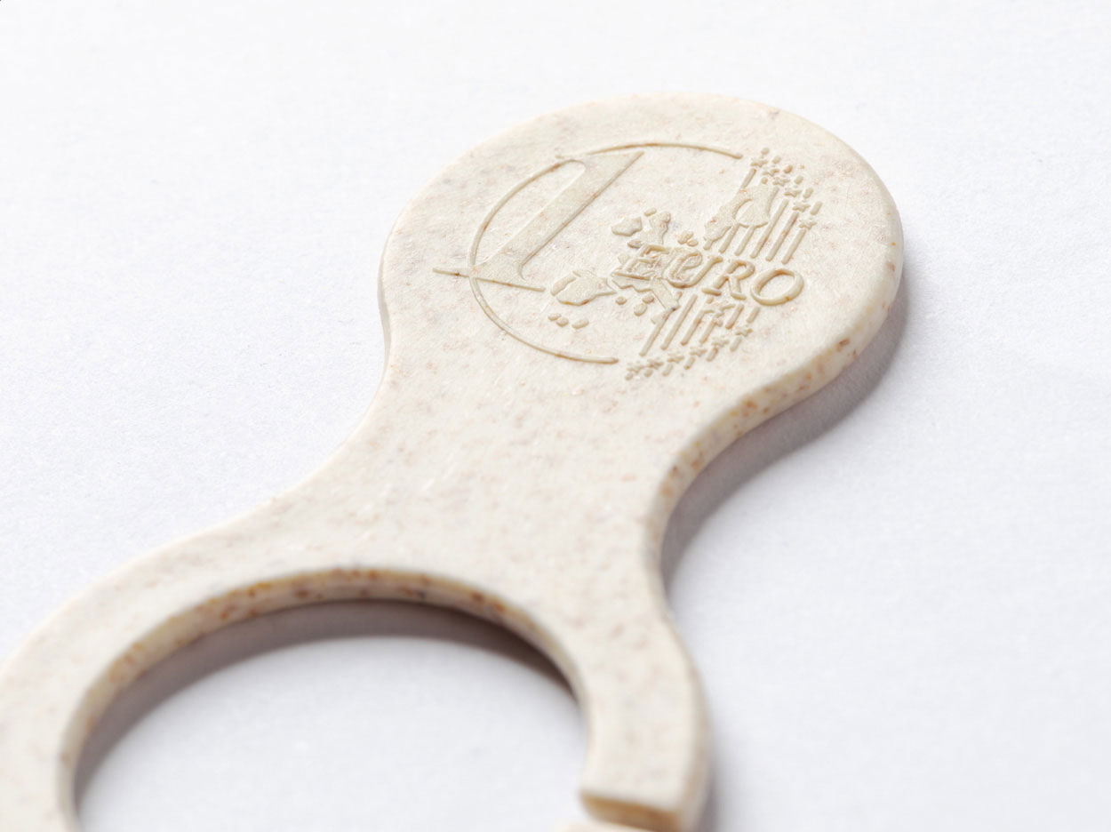 Plastový žeton do nákupního vozíku z ekologické pšeničné slámy a ABS s nápisem euro na jedné straně. Možnost tisku pouze z jedné strany.