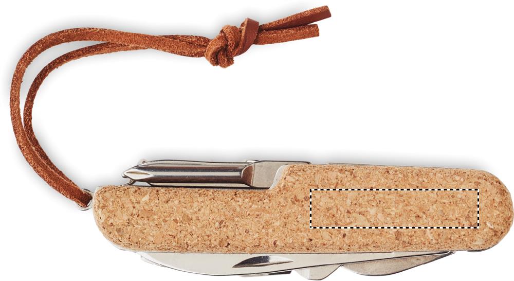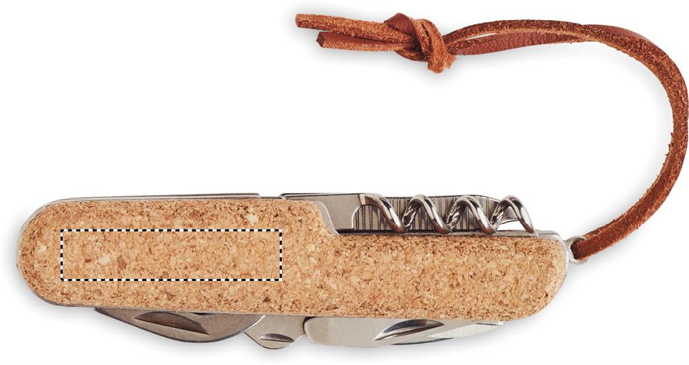Multifunkční kapesní nůž z nerezové oceli s korkovým potahem rukojeti a PU šňůrkou. Má 7 funkcí: otvíráky, nůž, nůžky, křížový šroubovák, pilník a vývrtku. Korek je přírodní materiál, vzhledem ke své struktuře a povrchové pórovitosti může být výsledek tisku na stejných předmětech rozdílný.