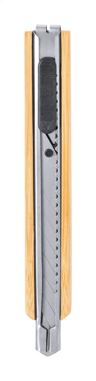 Kovový odlamovací nůž s bambusovou rukojetí a bezpečnostní pojistkou.