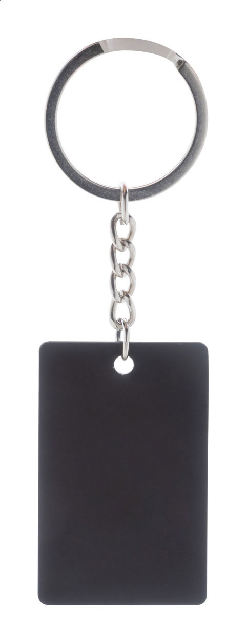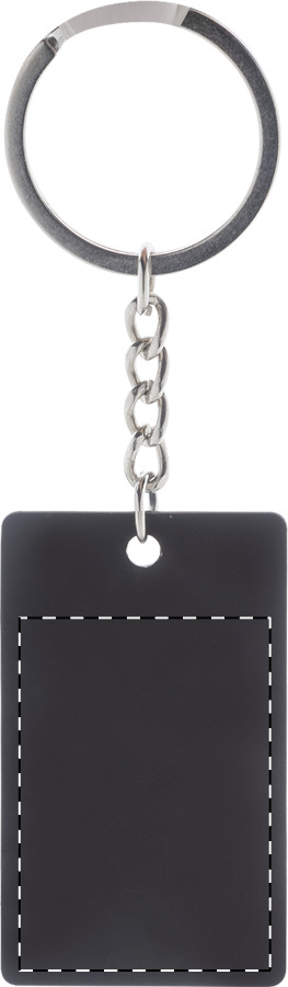 Přívěšek na klíče z recyklované nerezové oceli ve tvaru obdélníku s pogumovaným povrchem. Se speciální vrstvou pro zrcadlové laserové gravírování.
