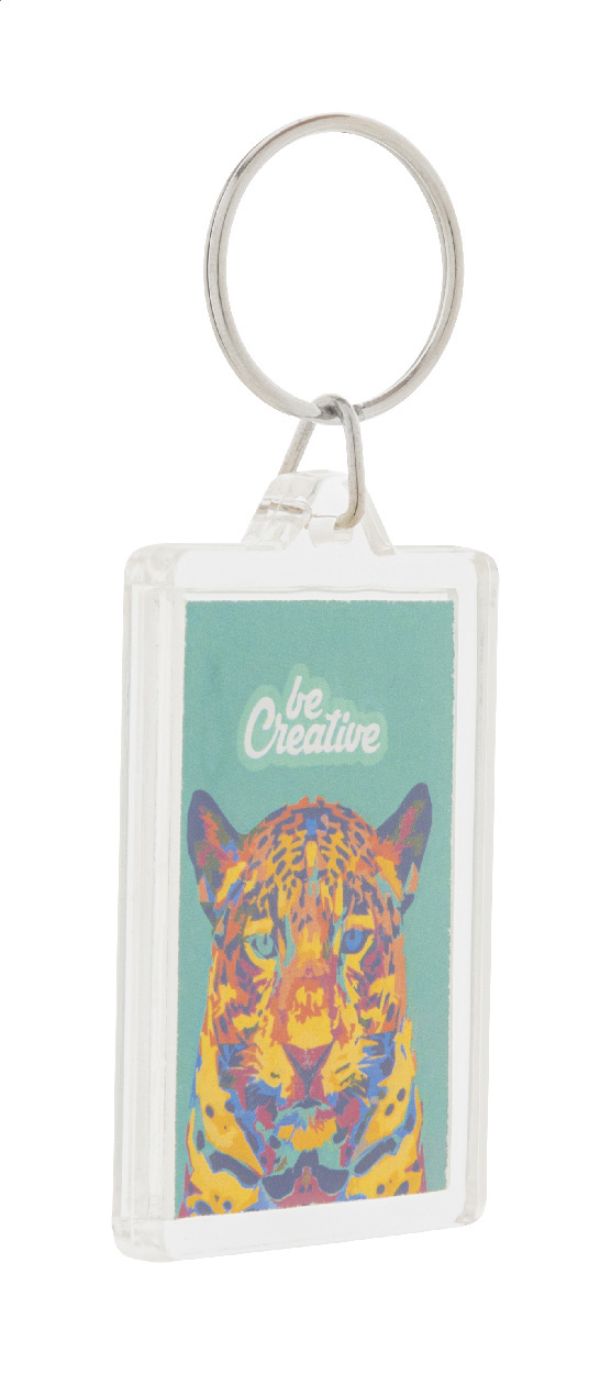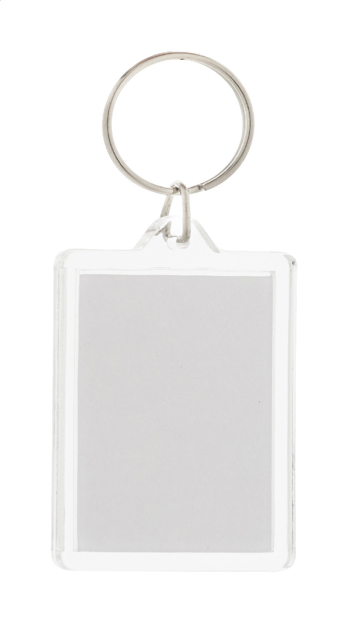 Přívěšek na klíče ve tvaru obdélníku z akrylu s barevnou papírovou vložkou na zakázku a kovovým kroužkem. Cena zahrnuje digitální tisk na obou stranách, nezahrnuje tiskovou přípravu. Min. mn.: 100 ks.