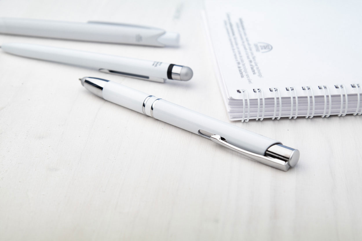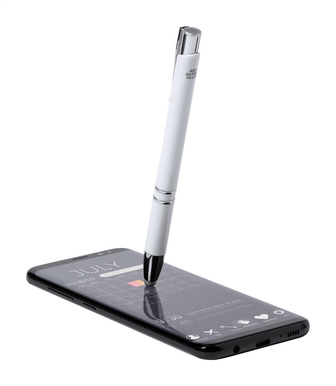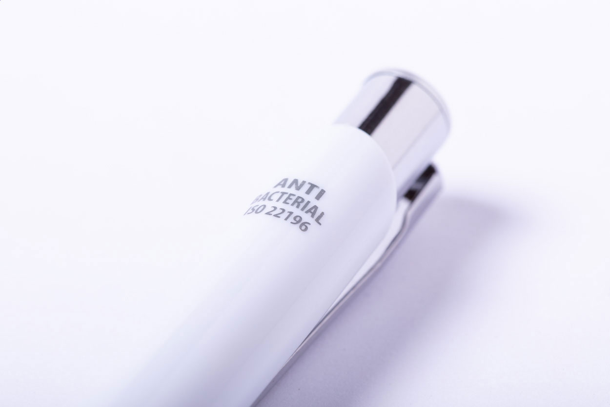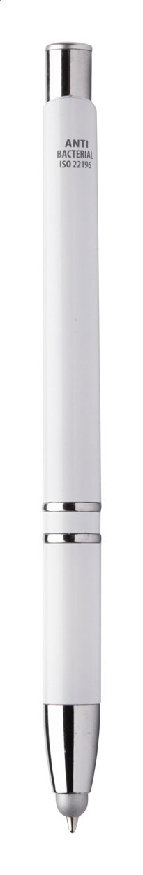 Antibakteriální plastové kuličkové pero a dotykové pero s modrou náplní. V souladu s ISO 22196.