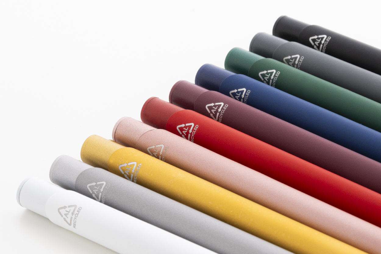 Kuličkové pero z recyklovaného hliníku s pogumovaným tělem a barevnými lesklými kovovými díly. Se speciálním povrchem pro zrcadlové gravírování, které odpovídá kovovým částem. S modrou náplní.