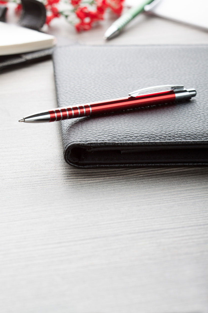 Hliníkové kuličkové pero s kovovým klipem a chromovanou špičkou a vrškem. Dodává se s modrou náplní.