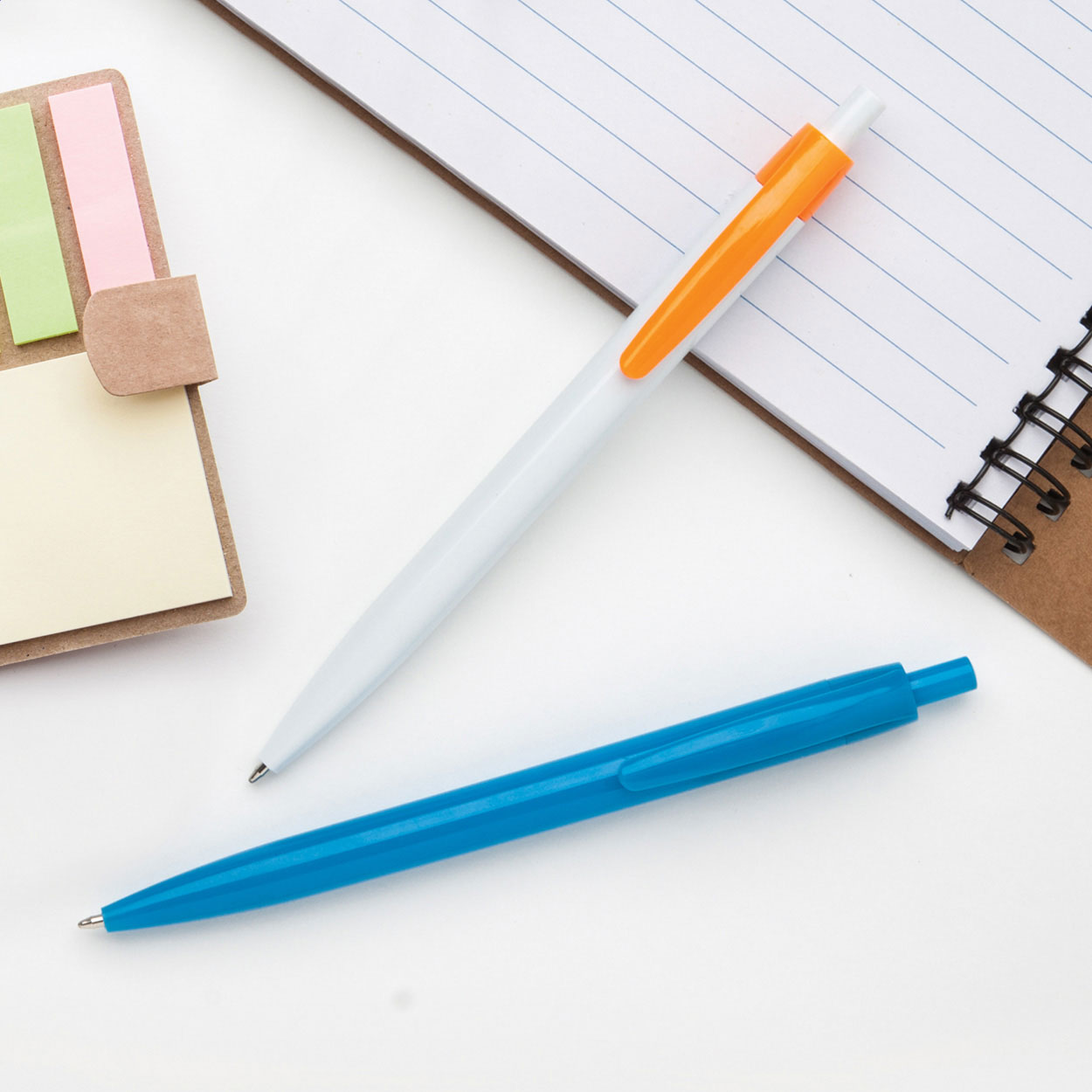 Plastové kuličkové pero s bílým tělem a barevným klipem, s modrou náplní.