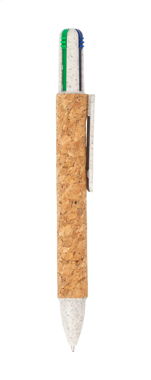 Ekologické plastové kuličkové pero z pšeničné slámy s pouzdrem potaženým přírodním korkem. Se 4 barevnými náplněmi: černá, modrá, zelená a červená.