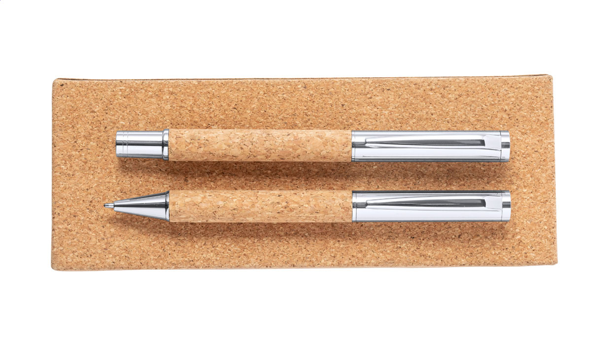 Elegantní sada kovového kuličkového pera a rolleru s tělem potaženým přírodním korkem. V dárkové krabičce z přírodního korku, s modrou náplní.