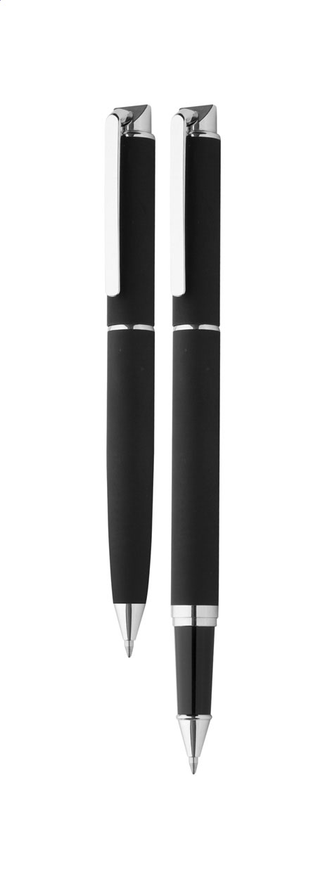 Sada per s černou náplní v dárkové papírové krabičce se zavíráním na magnet. Sada obsahuje keramické pero a kuličkové pero s gumovým povrchem.
