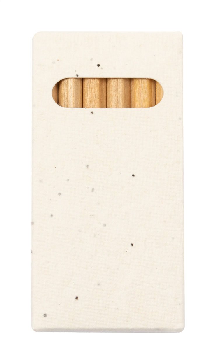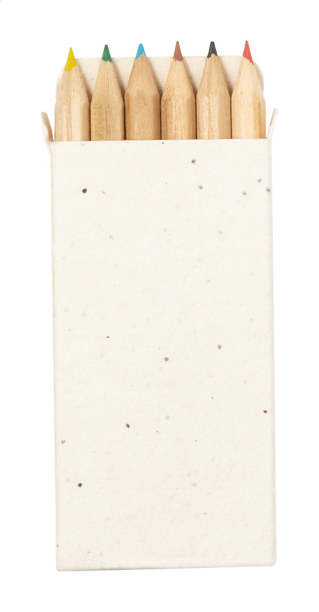 6dílná sada dřevěných barevných tužek v krabičce ze semenného papíru. Papírová krabička obsahuje semena petúnie v různých barvách, která lze po použití zasadit.