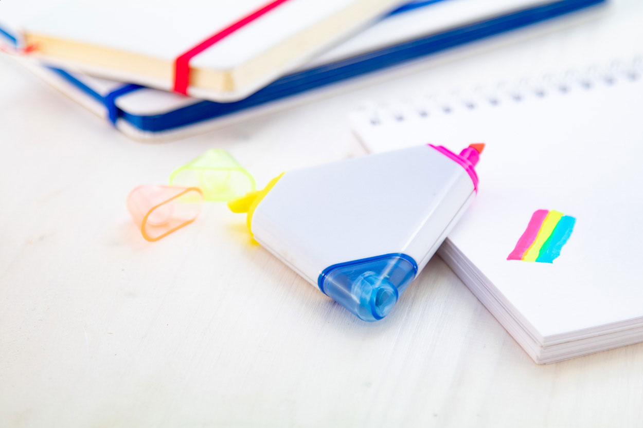 Zvýrazňovače ve tvaru trojúhelníku s 3 různými barvami a průhlednými kryty.